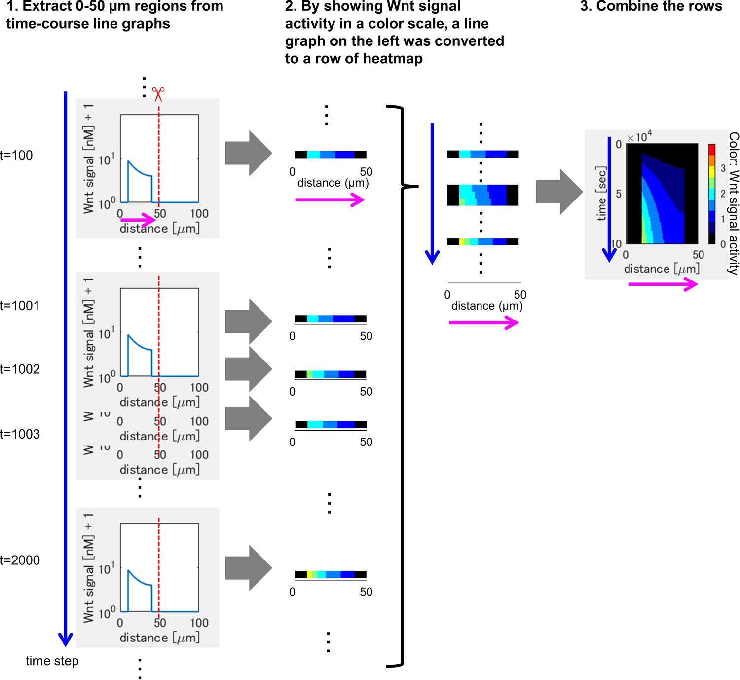 Figure 3-figure supplement 3. Method of heatmap drawing. (1) We extracted 0-50 μm regions from the line chart at each time point (time proceeds from upper to bottom). (2) By showing Wnt signaling activity in a color scale, a line chart on the left was converted to a row of heatmap. (3) By combining the rows in (2), heatmap was drawn. |