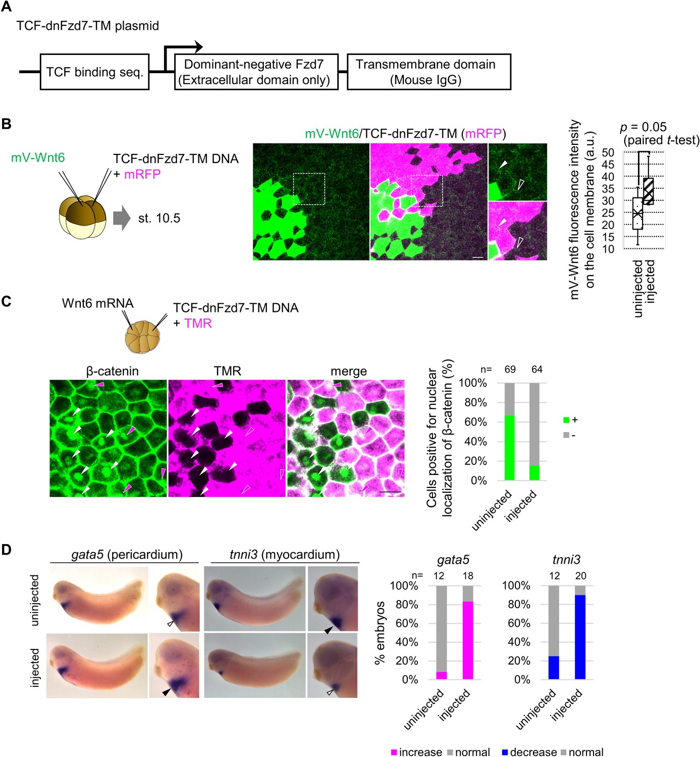 Figure 3-figure supplement 7. TCF-dnFzd7-TM accumulates Wnt6 protein but cell-autonomously inhibits Wnt signaling. (A) Schematic figure of the construct (TCF-dnFzd7-TM) inhibiting Fzd7 function in a Wnt-dependent manner. Luciferase sequence in TOPFlash plasmid was replaced with the sequence of dnFzd7, which is the extracellular domain of Fzd7, and mouse IgG transmembrane. (B) mV-Wnt6 mRNA and TCF-dnFzd7-TM plasmid (with mRFP mRNA) were injected into different blastomeres at the four-cell stage (as indicated in the left). mV-Wnt6 signal was high (arrowhead) on the cell membrane between cells with TCF-dnFzd7-TM plasmid injected (magenta), compared to that between intact cells (open arrowhead) as quantified in the graph. mVenus fluorescence intensity on the cell membrane was discretely measured on mRFP-positive cells (injected) and mRFP-negative cells (uninjected). Fluorescence intensities measured on neighboring cells were tested by paired t-test (n=5). The horizontal line indicates the median. Edges of boxes indicate the first and third quartiles. The cross indicates the mean, and whiskers indicate the minimum and maximum. These results indicate dnFzd7-TM can accumulate Wnt6 in a cell-autonomous manner. (C) Wnt6 mRNA and TCF-dnFzd7-TM plasmid (with a tracer, tetramethylrhodamine-dextran (TMR)) were injected into different blastomeres at the 16-cell stage. The hallmark of activated Wnt signaling, nuclear localization of β-catenin was reduced in the TCF-dnFzd7-TM injected cells magenta region, compared to the intact cells (non-magenta region) as quantified in the graph (Fisherâs exact test, p=2.7 x 10â9). Nuclear localizations of β-catenin are indicated by arrowheads (intact cells, white; dnFzd7-expressed cells, magenta). It should be noted that DNA injection generally induces mosaic expression, thus only some of the injected cells express dnFzd7-TM. (E) Injection of TCF-dnFzd7-TM induced gata5 expression (pericardium) and reduced tnni3 expression (myocardium) as quantified in the graph (Fisherâs exact test, p=1.4 x 10â5, 2.3 à 10â6, respectively). TCF-dnFzd7-TM was injected into two blastomere (prospective heart region) at the four-cell stage and fixed at st. 32. |