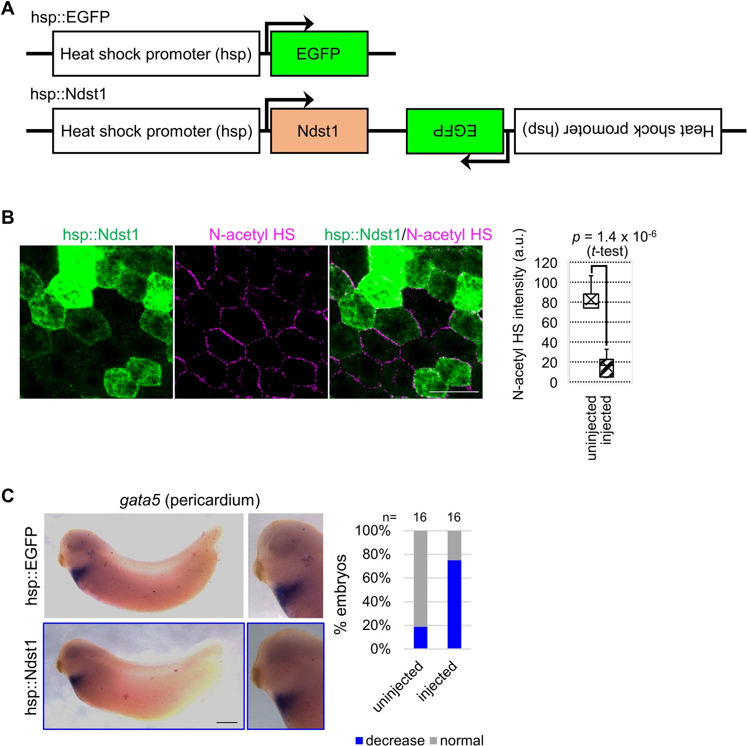 Figure 4-figure supplement 2. Heat-induced expression of ndst1 reduces N-acetyl HS and restricts gata5 expression. (A) Schematic figure of HSP constructs. (B) Ndst1 expression induced by hsp::Ndst1 reduces N-acetyl-rich HS. hsp::Ndst1 was injected into one blastomere at the four-cell stage. Heat shock was induced at st. 8/9 and IHC was performed at the gastrula stage (st. 11.5). Signal intensity of N-acetyl-rich HS on each membrane (injected, hsp::Ndst1 injected (green); uninjected (black)) was quantified as shown in the graph (n=6 each). The horizontal line indicates the median. Edges of boxes indicate the first and third quartiles. The cross indicates the mean, and whiskers indicate the minimum and maximum. (C) Heat-induced expression of ndst1 restricted gata5 expression (pericardium). hsp::Ndst1 or hsp::EGFP was injected into prospective heart region at the four-cell stage, and heat shock (33°C, 15 min x 3 times) was applied at st. 24. In situ hybridization against gata5 were performed at st. 32 as quantified in the graph (Fisherâs exact test, p=3.8 x 10â3). Scale bar: 30 μm (B), 0.5 mm (C). |