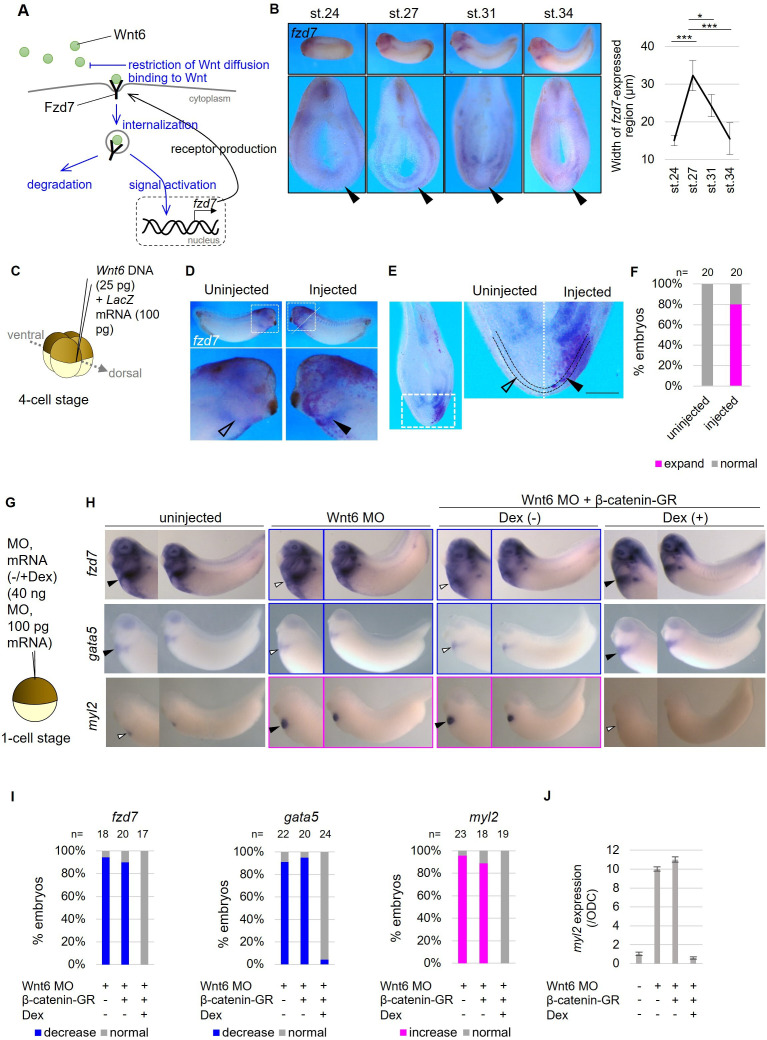 Figure 1-figure supplement 1. Wnt-dependent fzd7 expression and differentiation of the pericardium. (A) Schematic figure of Fzd7 receptor functions. Fzd7 binds to Wnt6. This binding itself restricts Wnt diffusion. In addition, Wnt-Fzd complex is internalized, and it decreases the amount of Wnt6 in the intercellular matrix, leading to restriction of Wnt distribution. Furthermore, Fzd7 activates Wnt signaling, resulting in the transcription of fzd7, forming a positive feedback loop to enhance the above restriction effects of Wnt distribution. (B) fzd7 expression during embryogenesis in Xenopus. fzd7-expressed region in prospective pericardium region is indicated by arrowheads and the width was quantified as shown in the graph. The expression was faintly observed at st. 24 and increased and expanded to st. 27. The expression was gradually decreased from st. 27 to st. 34. *, *** indicates p<0.05, 0.001, respectively (p=1.9 x 10â9, 1.9 à 10â2, 1.2 à 10â3, left to right in the graph; n=4 each). (CâF) Wnt6 DNA (25 pg) was injected into the marginal zone of one of dorsal blastomeres at the four-cell stage as indicated (C). LacZ mRNA was coinjected as a tracer in situ hybridization using fzd7 probe (DâE). The specimen was cut at the position of dashed line to make hemi-section (D). Around 80% of specimens showed expansion of fzd7 expression area in the injected side (arrowhead), which was not observed in the uninjected side (open arrowhead) (E, F; Fisherâs exact test, p=1.5 x 10â7). The pericardial region is the area between the dotted lines (E). Scale bar, 0.1 mm. (GâJ) Wnt6 MO and β-catenin-GR mRNA were injected into the animal pole at the one-cell stage. β-catenin-GR was activated at the tailbud stage with Dex (the schematic view of β-catenin-GR/Dex function was shown in Figure 1C). (HâI) The pericardium region (fzd7/gata5-expressed region) was restricted by wnt6 knockdown as previously reported and it was rescued by β-catenin activation as quantified in I (Fisherâs exact test, p=9.4 x 10â3, 9.9 à 10â5, respectively). Myocardium region (myl2-expressed region) was expanded by Wnt inhibition as reported and it was rescued by β-catenin activation as quantified in I (Fisherâs exact test, p=2.5 x 10â4). This result was confirmed by qRT-PCR (J; normalized by an internal control, ODC (ornithine decarboxylase). Bars represent standard deviation). The picture of uninjected control of gata5 is the same for Figure 1D. |