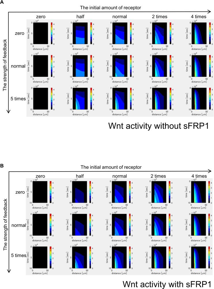 Figure 3-figure supplement 4. Time changes of Wnt signaling activity without sFRP1 (A) or with sFRP1 (B). Wnt signaling activity is decreased by sFRP1 expression. The steady state is reached earlier with sFRP1 than without sFRP1. Changes of Wnt signal activity shows patterns similar to those of the amount of free receptor (Figure 3âfigure supplement 6). |