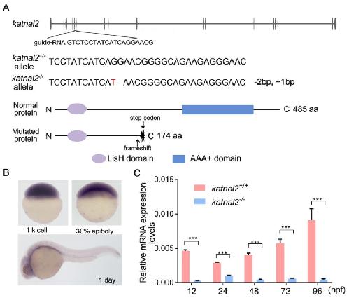 Figure 1. Generation of katnal2-/- allele by CRISPR/Cas9 gene-editing technology. (A) Structure of zebrafish katnal2 gene. The protein includes an N-terminal LisH (Lis-homology) domain and a C-terminal AAA catalytic domain. A guide-RNA was designed to target a 23 bp region in exon 6. The katnal2-/- allele contains a 2-base deletion and a 1-base insertion. The red color indicates the inserted nucleotides and the “-” indicates the deleted nucleotides. The mutation causes frameshift and early truncation of the protein prior to the AAA+ domain. (B) The expression pattern of katnal2 in the early embryonic development determined by in situ hybridization. (C) The expression level of katnal2 mRNA in katnal2+/+ (pink) and katnal2-/- (blue) alleles. Data are shown as mean ± S.E.M.; *** indicates p < 0.001.