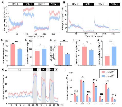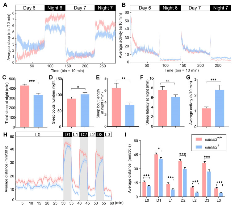 Figure 4. Katnal2-/- larvae displayed abnormal sleep/awake patterns and impaired locomotion activity. (A) Time sequence diagram of average sleep over time (N = 48 for each genotype). White and black bars above behavioral traces indicate the day (14 h) and night (10 h), respectively. (B) Time sequence diagram of average total activity over time. (C) Total sleep length on the sixth night. (D) Sleep bouts number on the sixth night. (E) Sleep bouts duration on the sixth night. (F) Sleep latency after light-off on the sixth night. (G) Average total waking activity on the sixth night. (H) The average distance moved within each 30 s bin under either light or dark conditions is plotted (N = 48 for each genotype). White and black bars above the behavioral traces indicate light (30 min or 5 min) and dark (5 min) conditions, respectively. (I) The average distance moved in 30 s during 30 min of light and three 5-min light/dark intervals. Data are shown as mean ± S.E.M.; * indicates p < 0.05, ** indicates p < 0.01, *** indicates p < 0.001 and ns indicates no significance.