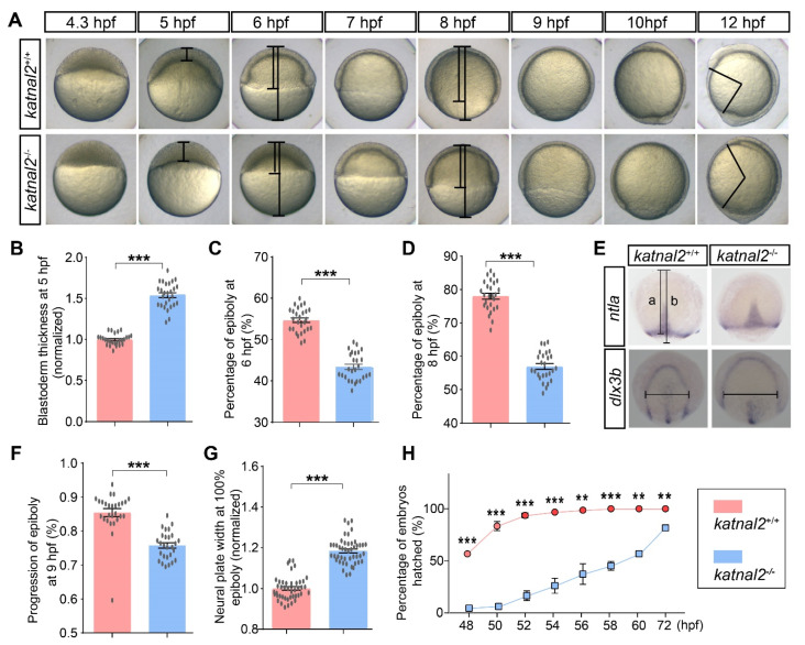 Figure 2. Katnal2-/- embryos exhibited developmentally delayed phenotypes. (A) Images of the embryos in time series from the initiation until the finish of epiboly. Images are lateral views with the animal pole on the top. (B) Normalized blastoderm thickness of the katnal2+/+ and katnal2-/- embryos at 5 hpf (+/+, N = 26; -/-, N = 27). (C,D) The epiboly progression at 6 hpf and 8 hpf (N = 27 for each genotype) measured as indicated in panel (A). (E) Expression patterns of ntla in 9 hpf embryos and dlx3b in 100% epiboly embryos were analyzed by in situ hybridization. The line “a” represents the distance from the animal pole to the boundary of epiboly movement. The line “b” represents the distance between the animal and the plant pole. The horizontal line in dlx3b staining results represents the width of the neural plate. (F) katnal2-/- embryos exhibited epiboly movement delay at 9 hpf as determined by ntla staining (N = 27 for each genotype). (G) Normalized neural plate width determined by dlx3b staining at 100% epiboly stage (+/+, N = 43; -/-, N = 46). (H) Percentage of embryos hatched was recorded every 2 h from 48 hpf to 60 hpf. Data are shown as mean ± S.E.M.; ** indicates p < 0.01, and *** indicates p < 0.001.