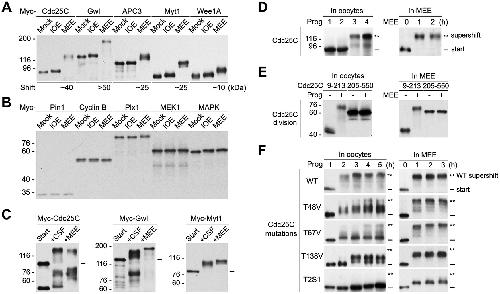 FIGURE 1: Reconstitution of the M-phase supershift of the five key mitotic regulators by phosphorylation of recombinant proteins with MEE. (A) Phosphorylation of myc-tagged Xenopus Cdc25C, Gwl, APC3, Myt1, and Wee1A with IOE or MEE for 2 h, followed by immunoblotting with anti-myc tag antibodies. (B) Phosphorylation of myc-tagged human Pin1, sea urchin cyclin B â90, Xenopus Plk1 (Plx1), Xenopus MEK1, and Xenopus MAPK with IOE or MEE for 2 h, followed by myc-tag immunoblotting. (C) Phosphorylation of myc-tagged Cdc25C, Gwl or Myt1 with CSF extract or MEE, followed by myc-tag immunoblotting. (DâF) Left panels show results from progesterone stimulation of Xenopus oocytes that ectopically expressed each of the indicated myc-tagged Cdc25C proteins for the indicated hours, followed by oocyte extraction and myc-tag immunoblotting. Right panels show results from phosphorylation of the TNT products of the same myc-tagged Cdc25C proteins with MEE for the indicated hours, followed by myc-tag immunoblotting. |