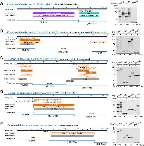 FIGURE 2: Association of the M-phase supershift with specific protein regions. Cdc25C (A), Gwl (B), APC3 (C), Myt1 (D), and Wee1A (E) were each divided into indicated fragments according to their functional domains from NCBI search, with indication of the supershift fragments identified by four asterisks (left). Indicated myc-tagged full-length and fragment proteins were phosphorylated with MEE for 2 h, followed by myc-tag immunoblotting (right). Estimated magnitudes of the MEE-induced gel mobility shifts for different proteins are indicated. |