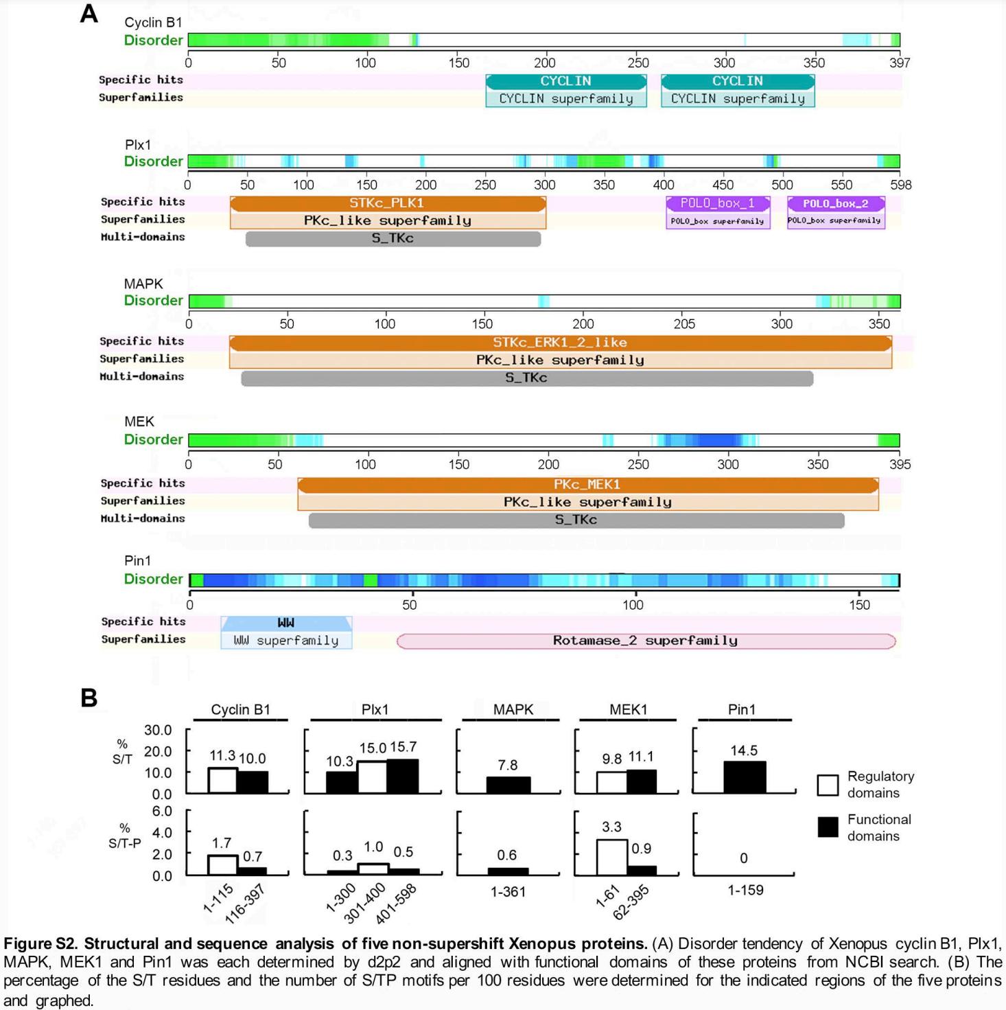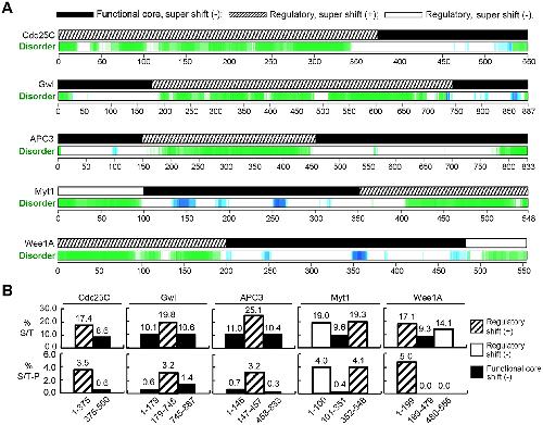 FIGURE 3: Common features of the supershift fragments. (A) Prediction of disordered regions in Xenopus Cdc25C, Gwl, APC3, Myt1, and Wee1A (green and blue) by d2p2 with parallel indication of the supershift ability of tested fragments. (B) The percentage of S/T residues (upper) and the number of S/TP motifs per 100 residues (lower) were determined for indicated fragments of the five proteins and graphed. |