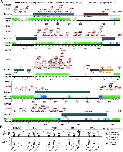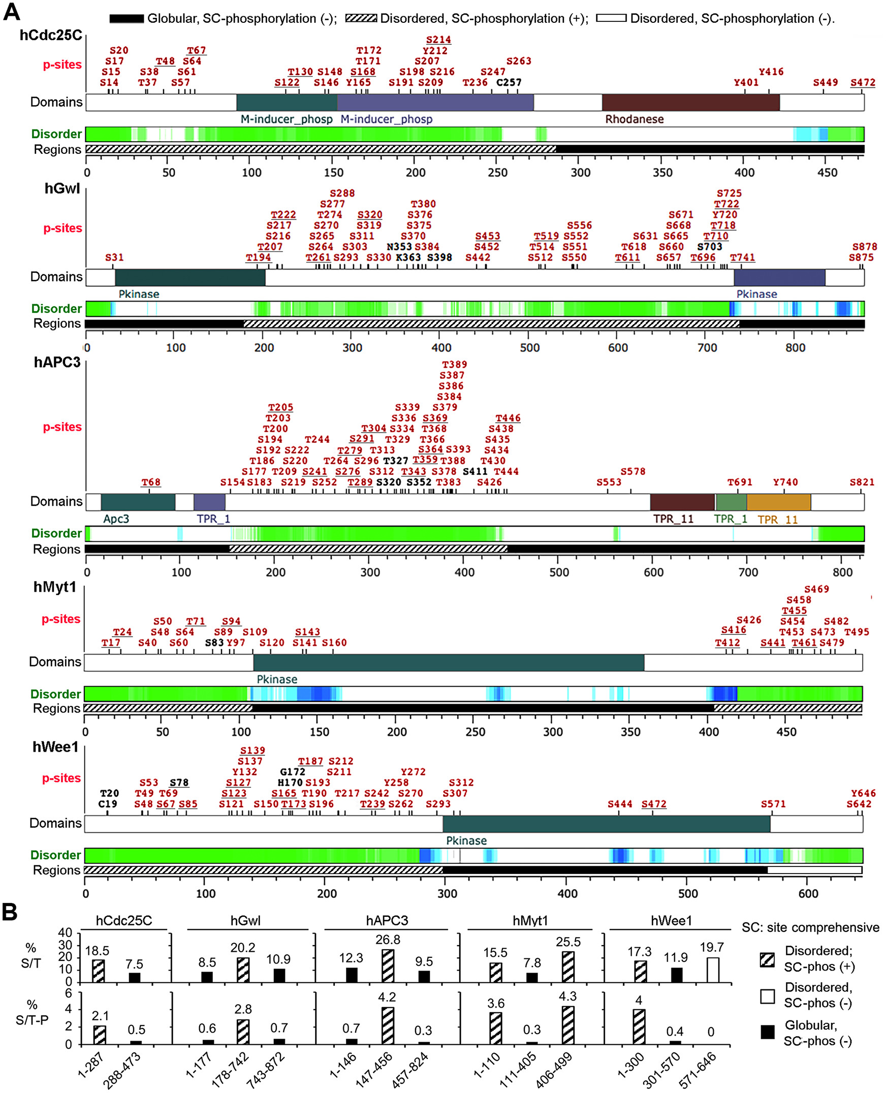 FIGURE 6: Informatic analysis of phosphorylation patterns of human Cdc25C, Gwl, APC3, Myt1, and Wee1. (A) Curated compilation of previously identified phosphorylation sites in human Cdc25C, Gwl, APC3, Myt1, and Wee1 with parallel indications of intrinsically disordered regions (green and blue) and similar divisions as done for their Xenopus orthologs. Proline-directed phosphorylation sites are underlined. Black sites indicate phosphorylated S/T residues in equivalent positions of rodent orthologs. (B) The percentage of S/T residues (upper) and the number of S/TP motifs per 100 residues (lower) are graphed for indicated fragments of the five proteins. |