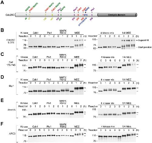FIGURE 8: Phosphorylation of the five mitotic regulators with the four major mitotic kinases produced by TNT is insufficient to produce the M-phase supershift. (A) A schematic diagram of Cdc25C with illustration of the major Cdk1, MAPK, Plx1, and RSK2 phosphorylation sites identified in the supershift domain. (BâF) Myc tagged Cdc25C9-375 (B), Gwl179-745 (C), Myt1 (D), Wee1A (E), and APC3 (F) were each phosphorylated either with the four major mitotic kinases individually in parallel with MEE (left panels) or with the four kinases collectively (4 kinase mix) in parallel with 1:4 MEE (right panels) for the indicated hours, followed by myc-tag immunoblotting. |