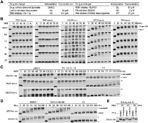 FIGURE 10: Inhibition of the four major mitotic kinase activities had little effect on MEE-induced supershifts of the five supershift fragments. (A) Kinase inhibitors and their concentrations used in MEE. (B) Phosphorylation of indicated supershift fragments with MEE in the presence of individual kinase inhibitors for the indicated minutes, followed by myc-tag immunoblotting. (C, D) Phosphorylation of indicated supershift fragments with MEE in the presence of all four of specific kinase inhibitors or ST for the indicated minutes, followed by myc-tag immunoblotting. (E) Side-by-side myc-tag immunoblotting of the Gwl179-745 samples from three different time points in D. |