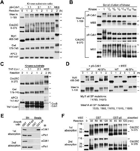 FIGURE 12: p9-enhanced multisite phosphorylation by the Cdk1/CycB complex does not play a physiologically important role in the M-phase supershift. (A) Phosphorylation of myc-tagged five supershift fragments with increased ratios of p9-Cdk1:substrate or MEE for the indicated hours, followed by myc-tag immunoblotting. (B) Parallel phosphorylation of myc-tagged Cdc25C9-375 or Wee1A1-199 with serial dilutions of p9-Cdk1 or MEE for 1 h, followed by myc-tag immunoblotting. (C) Parallel phosphorylation of each of the indicated myc-tagged supershift fragments with increased ratios of TNT-Cdk1:substrate or MEE for the indicated hours, followed by myc-tag immunoblotting. (D) Parallel phosphorylation of WT and all SP mutant form (All SPs) of myc-tagged Myt1406-548 or Wee1A1-199 with p9-Cdk1 or MEE for the indicated hours, followed by myc-tag immunoblotting. The mutant sites in the two proteins are specified. (E) MEE was absorbed with GST or GST-p9 once or twice, and the SN and bound proteins (beads) were immunoblotted with anti-Cdk1 or anti-Plx1 antibodies. (F) Phosphorylation of myc-Cdc25C9-375 for the indicated minutes with MEE that was absorbed with GST- or GST-p9 once or twice, followed by myc-tag immunoblotting. |