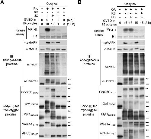 FIGURE 13: The four major mitotic kinases are not required for the M-phase supershift in OA-induced Xenopus oocyte maturation. (A) Xenopus oocytes were injected with mRNA for each of the five myc-tagged supershift fragments and cultured for 6â8 h. These injected oocytes were further cultured in the presence of indicated kinase inhibitors for 2â4 h and then either stimulated with progesterone (Prog) (A) or injected with OA (B) in the continued presence of the kinase inhibitors. GVBD was scored at the indicated h. Proteins extracts of lastly collected oocytes were assayed for H1 kinase activity by 32P incorporation and immunoblotted with indicated antibodies. |