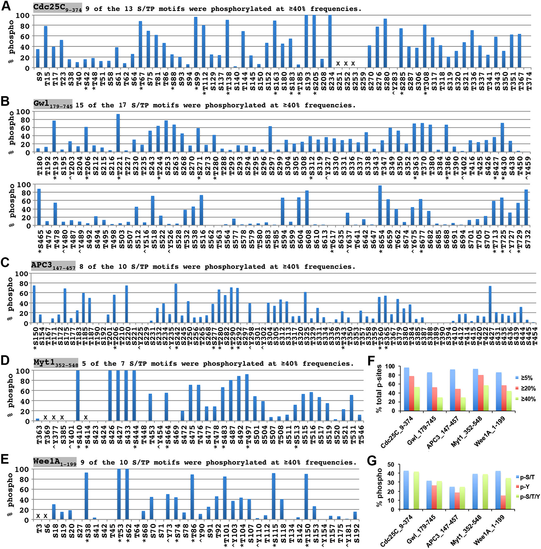 FIGURE 5: Widespread medium to high phosphorylation stoichiometries in the supershift domain. (A–E) Phosphorylation identification frequencies for individual S/T/Y residues in Cdc25C9-374 (A), Gwl179-745 (B), APC3147-457 (C), Myt1352-548 (D), and Wee1A1-199 (E). Asterisks indicate proline-directed S/T residues, and < symbols indicate tyrosine residues. Crosses indicate the S/T/Y residues in nonrecovered regions. (F) Percentages of the phosphorylation sites that were identified at ≥5%, ≥20%, and ≥40% frequencies by mass spectrometry for the five supershift fragments. (G) Percentages of total S/T, Y, or S/T/Y residues recovered from each of the five supershift fragments that were phosphorylated. |