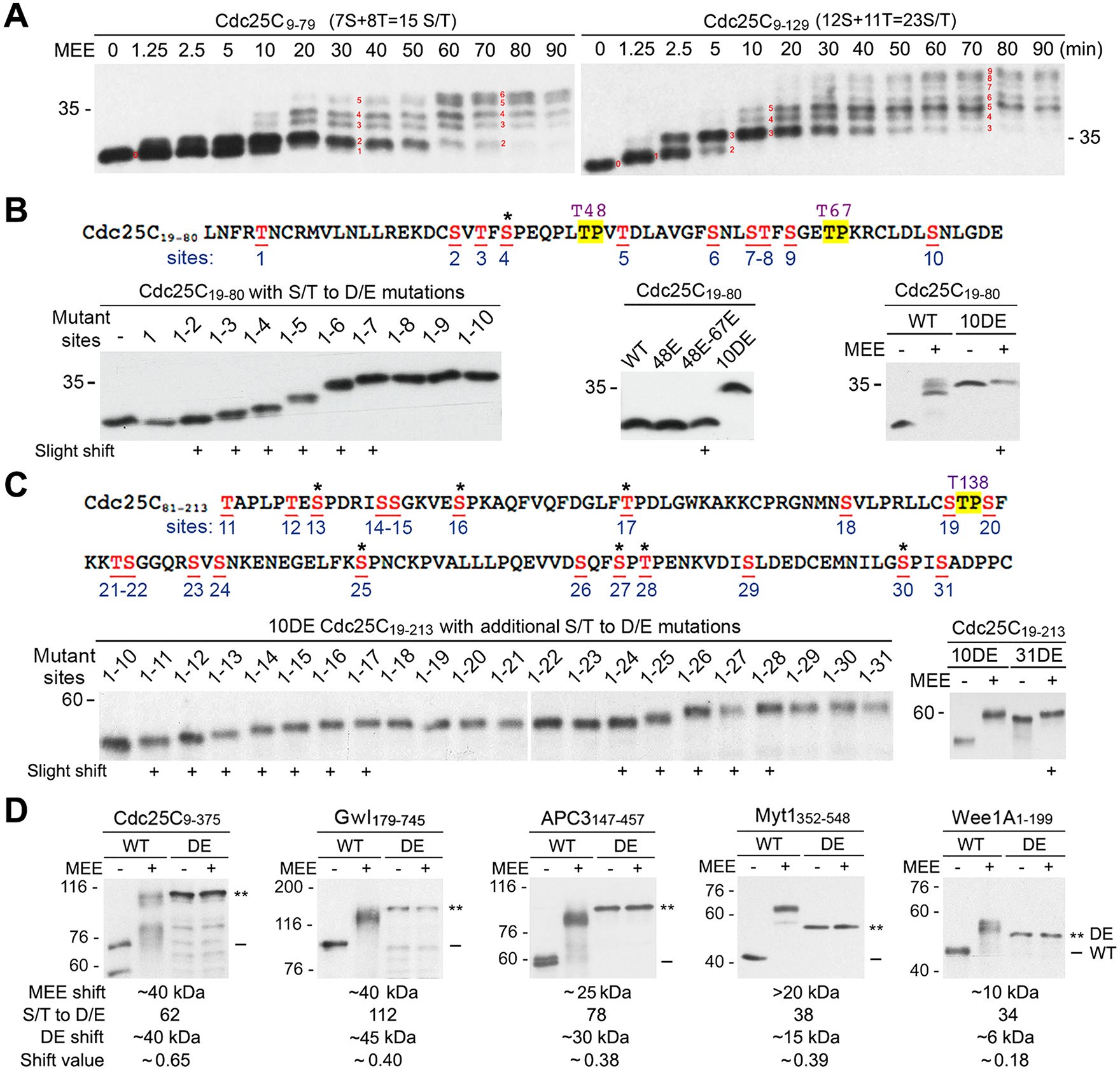 FIGURE 7: Generation of supershifts by additive numerous small shifts. (A) Phosphorylation of myc-tagged Cdc25C9-79 (left) and Cdc25C9-129 (right) for the indicated minutes, followed by myc-tag immunoblotting. Red numbers indicate discernible steps in the process of developing the supershift. (B) The upper panel shows the amino acid sequence of Cdc25C19-80 with numbering of the 12 S/T residues (red underlined), with conserved TP motifs at T48 and T67 highlighted by yellow, and the additional proline-directed S/T residue is indicated by an asterisk. The lower panel shows myc-tag immunoblots of different mutant forms of Cdc25C19-80 without MEE treatment (left and middle) or with MEE treatment (right). (C) The upper panel shows the amino acid sequence of Cdc25C81-213 with numbering of the 22 S/T residues, with the conserved TP motifs at T138 highlighted by yellow and the remaining six proline-directed S/T residues indicated each by an asterisk. The lower panel shows myc-tag immunoblots of different mutant forms of 10DE Cdc25C19-213 without MEE treatment (left) or with MEE treatment (right). (D) Phosphorylation of myc-tagged wild type (WT) or all ST-to-DE mutant forms (DE) of the five supershift fragments with MEE for 2 h, followed by myc-tag immunoblotting. The shift value was calculated by dividing the shift kDa from all DE mutations by the total number of DE mutations. |