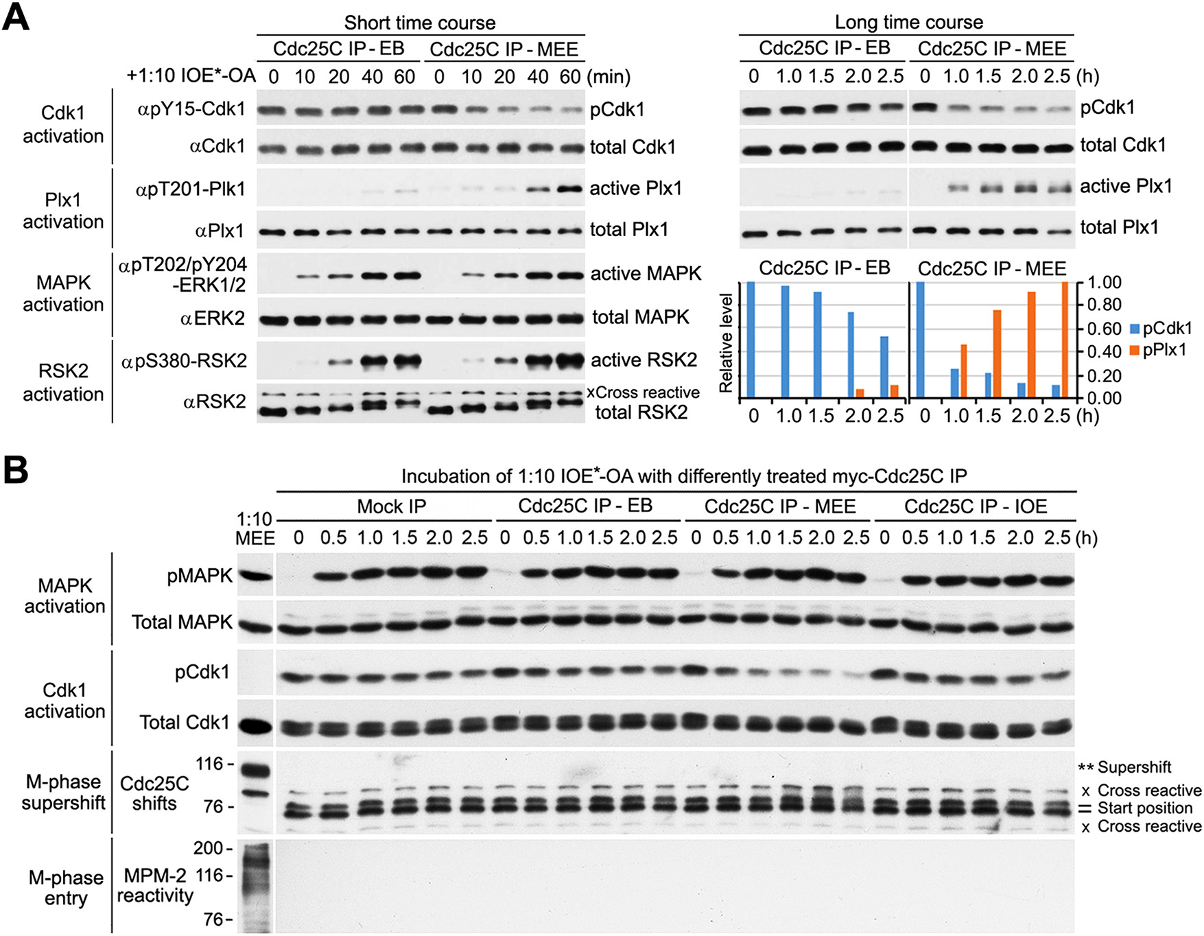 FIGURE 9: Activation of all four of the major mitotic kinases in IOE is insufficient to induce the M-phase supershift. (A) 1:10-IOE*-OA was incubated with EB-treated or MEE-phosphorylated myc-Cdc25C immunocomplex at indicated intervals for up to 60 min (short time course) or for up to 2.5 h (long time course), followed by immunoblotting with indicated antibodies to visualize activations of Cdk1, Plx1, MAPK, and RSK2. (B) 1:10-IOE*-OA was incubated for the indicated hours with either control IgG immunoprecipitate (mock IP) or myc-Cdc25C immunoprecipitate (Cdc25 IP) that had been treated with EB, MEE, or IOE. After beads were pelleted down at indicated time points, SN proteins were immunoblotted in parallel with 1:10 MEE with the same antibodies as used in A and B to visualize activations of MAPK and Cdk1, with anti-Cdc25C antibodies to visualize gel mobility shifts of endogenous Cdc25C, and with MPM-2 to assess M-phase entry. |