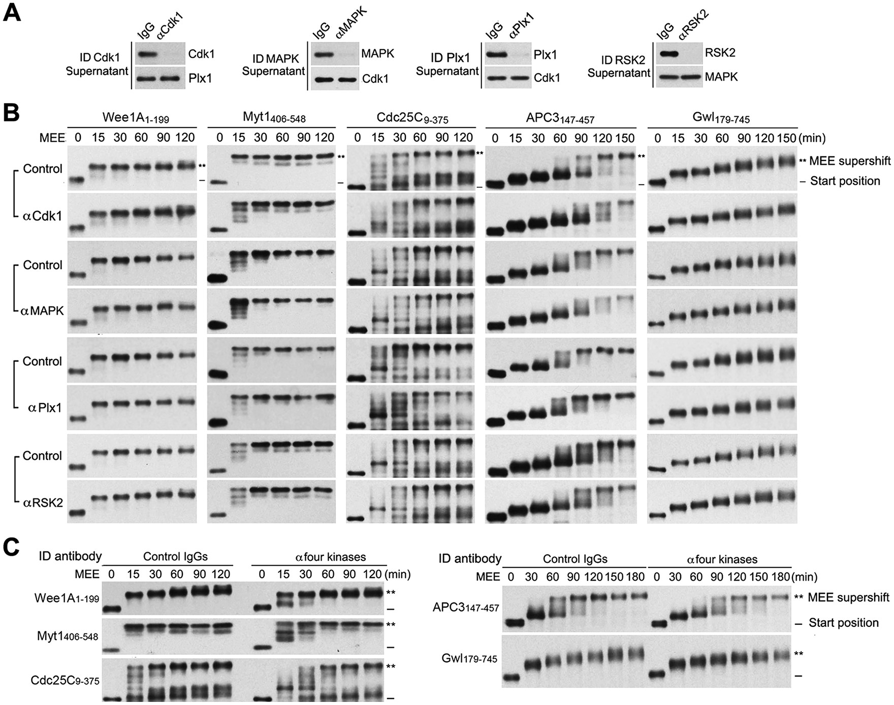 FIGURE 11: Immunodepletion of the four major mitotic kinases had no or minor effects on MEE-induced supershifts of the five supershift fragments. (A) Immunodepletion of MEE with each of indicated kinase-specific antibodies or control IgG, followed by immunoblotting of SNs with antibodies for each of indicated proteins. (B) Phosphorylation of each of myc-tagged supershift fragments with individual kinase-depleted or control IgG-absorbed MEE for the indicated minutes, followed by myc-tag immunoblotting. (C) Phosphorylation of each of myc-tagged supershift fragments with all four kinase-depleted or control IgG-absorbed MEE for the indicated minutes, followed by myc-tag immunoblotting. |