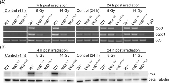 mutants. (A) RT‐PCR analysis of tp53 and ccng1 expression in samples indicated in the image. odc was used as a RNA loading control. Identical results were obtained in three independent experiments. (B) Western blot analysis shows P53 levels in samples as indicated. Beta tubulin was used as a protein loading control. h, hour; WT, wild‐type. This experiment was carried out once. |