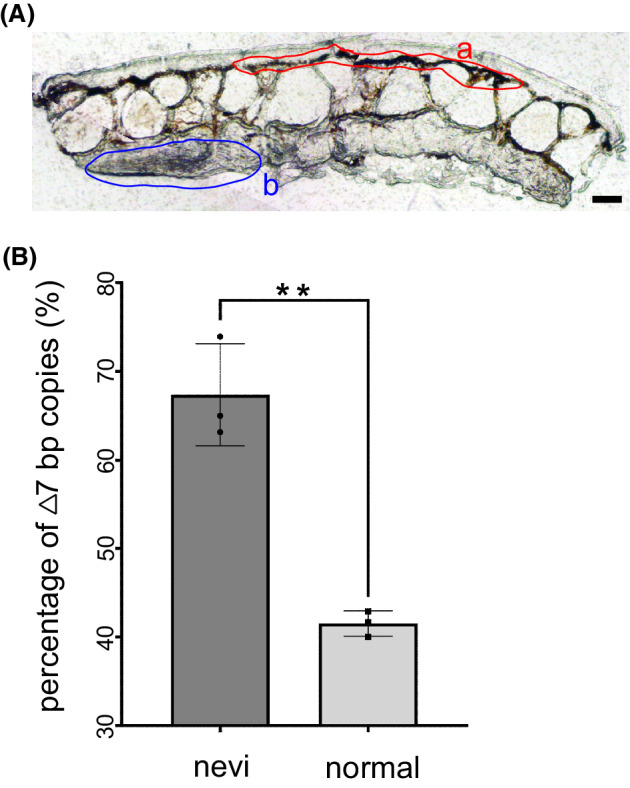 mutant shows areas for laser capture microdissection‐mediated collection of lesion cells (a) and non‐lesion cells (b). Scale bar, 50 μm. (B) Histograms of Sanger DNA sequencing data (mean values ± SD) from three independent PCR amplifications show the occurrence of LOH in lesion cells. graphpad prism 9 (GraphPad Software) was used for the t‐test (**P < 0.01). |