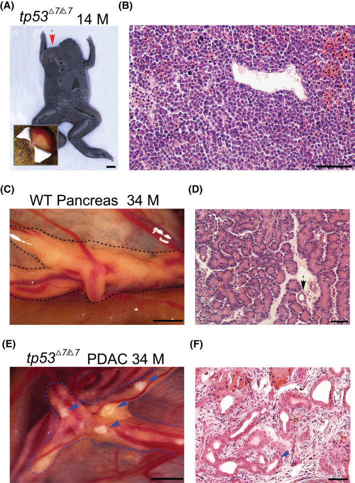 frog shows the location of the sarcoma (red dashed arrow). Dissection of the overlying skin revealed that the sarcoma grew from the hypodermis (bottom‐left corner). Scale bar, 5 mm. (B) Representative H&E staining of the sarcoma sections revealed histopathologic characteristics resembling human round cell sarcoma [38]. Similar structure was observed in all 50 serial sections. Scale bar, 50 μm. (C) Representative morphology of a dissected fresh pancreas from a 34‐month‐old wild‐type Xenopus tropicalis frog. Two frogs were dissected and similar pancreas morphology was observed. (D) Representative histology of the pancreas shown in C. Dashed arrow points to a normal pancreatic duct. Similar structure was observed in all 50 serial sections. (E) Morphology of a dissected pancreas from a 34‐month‐old tp53