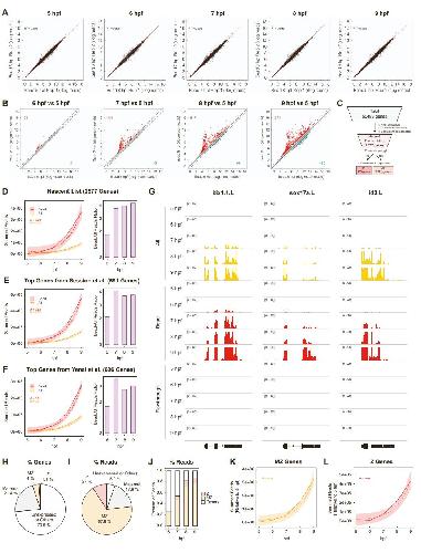 Figure S1. EU-RNA-seq to characterize the nascent transcriptome in early Xenopus embryogenesis. Related to Figure 1. (A) Reproducibility of nascent transcriptome library reads among replicates. Nascent EU-RNA-seq was performed on two clutches of early embryos (Rep 1 and Rep 2) from 5-9 hpf. Each dot represents individual genes with rlog reads quantified by DESeq2. Red line: linear fitting of the data in each plot; R squared values for fit. (B) Beads biochemically capture the nascent transcriptome. Increase in nascent EU-RNA-seq reads each hpf compared to pre-ZGA, 5 hpf. Each dot represents individual genes with rlog reads averaged from duplicates quantified by DESeq2. The numbers are genes enriched above 1.5-fold threshold (dashed lines). Red and blue dots indicate increased and decreased nascent transcripts at each hpf as compared with 5 hpf, respectively. (C) Schematic describing filtering the transcription data to define the bona fide nascent transcriptome for whole embryos at 5-9 hpf. The nascent list is further split into zygotic-only (Z) and maternal-zygotic (MZ) genes based on absence or presence of reads in the egg. (D-F) Enhanced sensitivity: comparison of reads levels from nascent EU-RNA-seq versus total RNA-seq. (Left) Summed reads for selected nascently transcribing genes (D, N = 2577), top genes from Session et al. (E, N = 591) and top genes from Yanai et al. (F, N = 696) from 5-9 hpf. Red, EU-RNA-seq for bead-purified nascent RNAs; Orange, total RNA-seq for all RNAs. Exponential fitting is shown with 95% CI. (Right) Enrichment of reads in nascent transcriptome as compared with total transcriptome over time. The ratio of summed Bead/All reads was calculated for each hpf from 6-9 hpf. (G) Genome browser view of reads for representative zygotic genes. Comparing total RNA-seq (top, All; orange), nascent EU-RNA-seq (middle, Bead; red) and maternal RNA-seq (bottom, Flowthrough; blue). The scales are set to the same level for each gene. Reads for these zygotic genes are higher in nascent (bead) transcriptome and absent from the maternal transcriptome (flowthrough), indicating biochemical separation of nascent from maternal. (H-J) Composition of genes or reads expressed during ZGA. (H) Percentage of genes that are unexpressed, maternal, or induced: maternal-zygotic (MZ) vs. zygotic (Z). (I) Percentage of total reads from nascent transcriptome (Bead) that can be categorized. (J) Fraction of assigned reads from nascent transcriptome (Bead) as development progresses. (K and L) Summed reads for MZ (K) and Z (L) genes from 5-9 hpf. Showing increase of reads, subtracting background (5 hpf). Exponential fitting is shown with 95% CI. (M) Heatmap for ATAC-seq peaks for genes whose activation was uniquely detected by EU-RNA-seq during 5-9 hpf in embryos at stages 10 and 12, respectively. Three replicates from each stage are shown (data source: Esmaeili et al., Dev Biol 2020). The regions of transcription start site (TSS) +/- 1kb are shown for each gene (each row represents each gene; N = 240 in total). The indicated regions of majority genes are accessible by stage 10 and further increased at stage 12. (N) Profile plot for ATAC-seq intensity in M. |