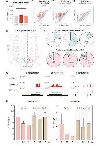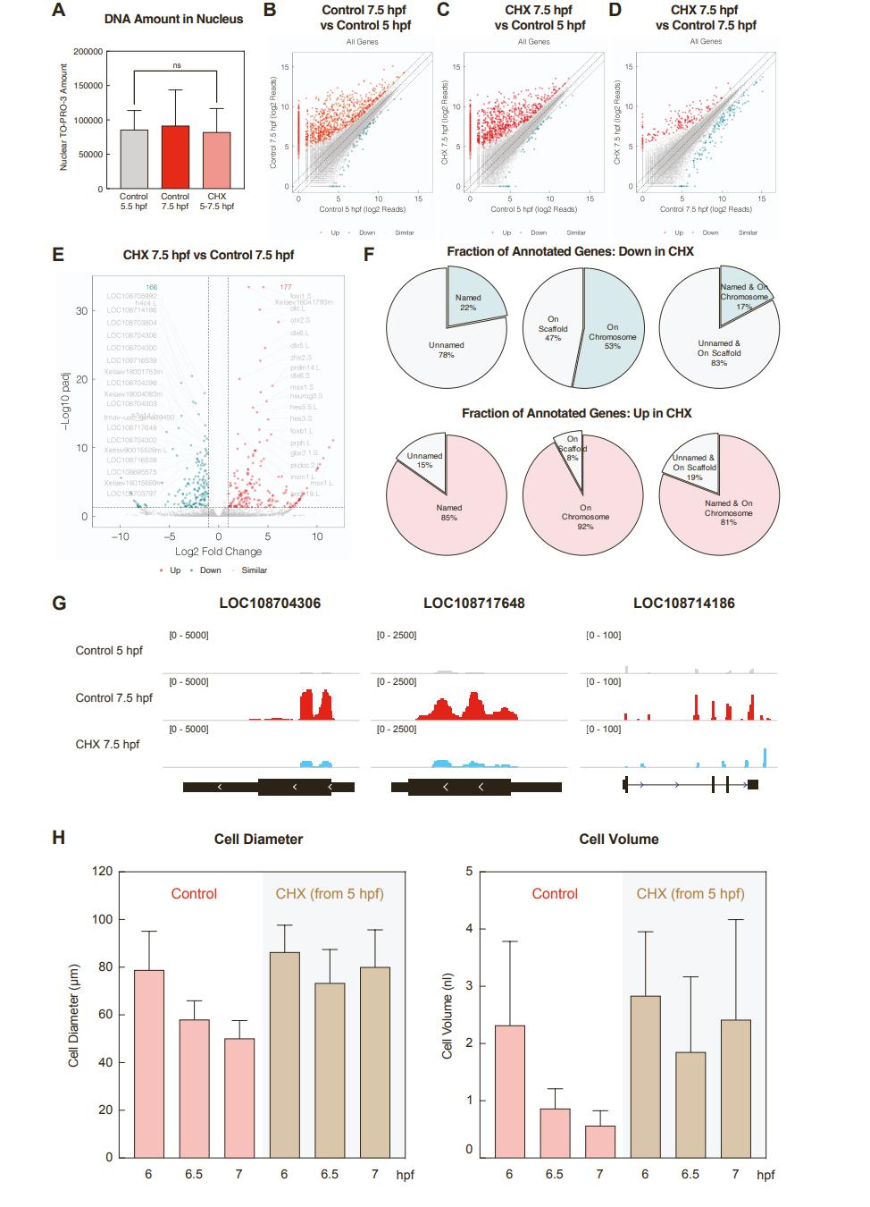 Figure S3. Effect of CHX on nascent zygotic transcription. Related to Figure 3. (A) DNA amount in nucleus of control embryos or embryos treated with cycloheximide (CHX). DNA was stained with TO-PRO-3 and the nuclear DNA amount was calculated by multiplying the nuclear intensity (subtracted with cytoplasmic background) by the volume of nucleus. Analyzed cell numbers from representative images: N = 66 (Control 5.5 hpf), N = 61 (Control 7.5 hpf), and N = 57 (CHX 5-7.5 hpf). Data are represented with Mean + SD. ns, not significant. (B-C) Increase in nascent transcription from 5 to 7.5 hpf for control (A) and cell cycle elongated (B) embryos. Using all genes in the genome. Each dot represents individual genes with log2 reads averaged from duplicates quantified by DESeq2. Differentially enriched genes in each group are labelled in red (up) and blue (down), based on a 1.5-fold threshold (dashed lines) and padj <0.05. (D) Comparison of log2 reads from cell cycle elongated (CHX) versus control embryo at 7.5 hpf, during widespread ZGA onset. Each dot represents each gene in the genome. (E) Volcano plot showing fold-change in expression comparing cell cycle elongated (CHX) versus control embryos. Labels show top 20 genes most differentially expressed. The numbers of up-regulated (red) and down-regulated (blue) genes by CHX are indicated. The horizontal dashed line indicates 1.3 (a threshold of padj = 0.05) and the two vertical dashed lines indicate -1 and 1, respectively (a threshold of 2-fold change). (F) Comparison of gene annotation information between down-regulated (top) and up-regulated (bottom) genes in the cell cycle elongated embryos (CHX) compared to control at 7.5 hpf. Showing percentage of genes that are named or unnamed, on chromosomes or unassigned scaffold contigs, or both. (G) Genome browser view of example genes only weakly induced by cell cycle elongation (CHX) compared to control. (H) Quantification of cell size in control and CHX-arrested embryos from 5 hpf. Cell size is represented as cell diameter (µm, Left) and cell volume (nl, Right) calculated by assuming a spherical shape of blastomeres. A total of 80-160 cells from at least three embryos were analyzed for each group. Data are represented as mean + SD. (I) RT-PCR for zygotic genes early activated in CHX-arrested embryos from 5 hpf to 5.5-8 hpf as compared with control embryos. The gene odc.S is used as a loading control. NTC, no-template control. LC, low contrast; HC, high contrast. (J) Inhibitor incubation from 5-7.5 hpf to characterize cell cycle arrest in blastula stage embryos. The final concentration in media is 0.2 mg/ml for CHX and 100 µM for the indicated Cdk inhibitors (~ 1,000 to 10,000-fold higher than respective Ki). Untreated and DMSO-treated embryos are used as controls. Only CHX is able to permeate Xenopus embryos o rapidly induce cell cycle arrest and Cdk inhibitors fail to arrest embryo division. Scale bar, 1 mm |