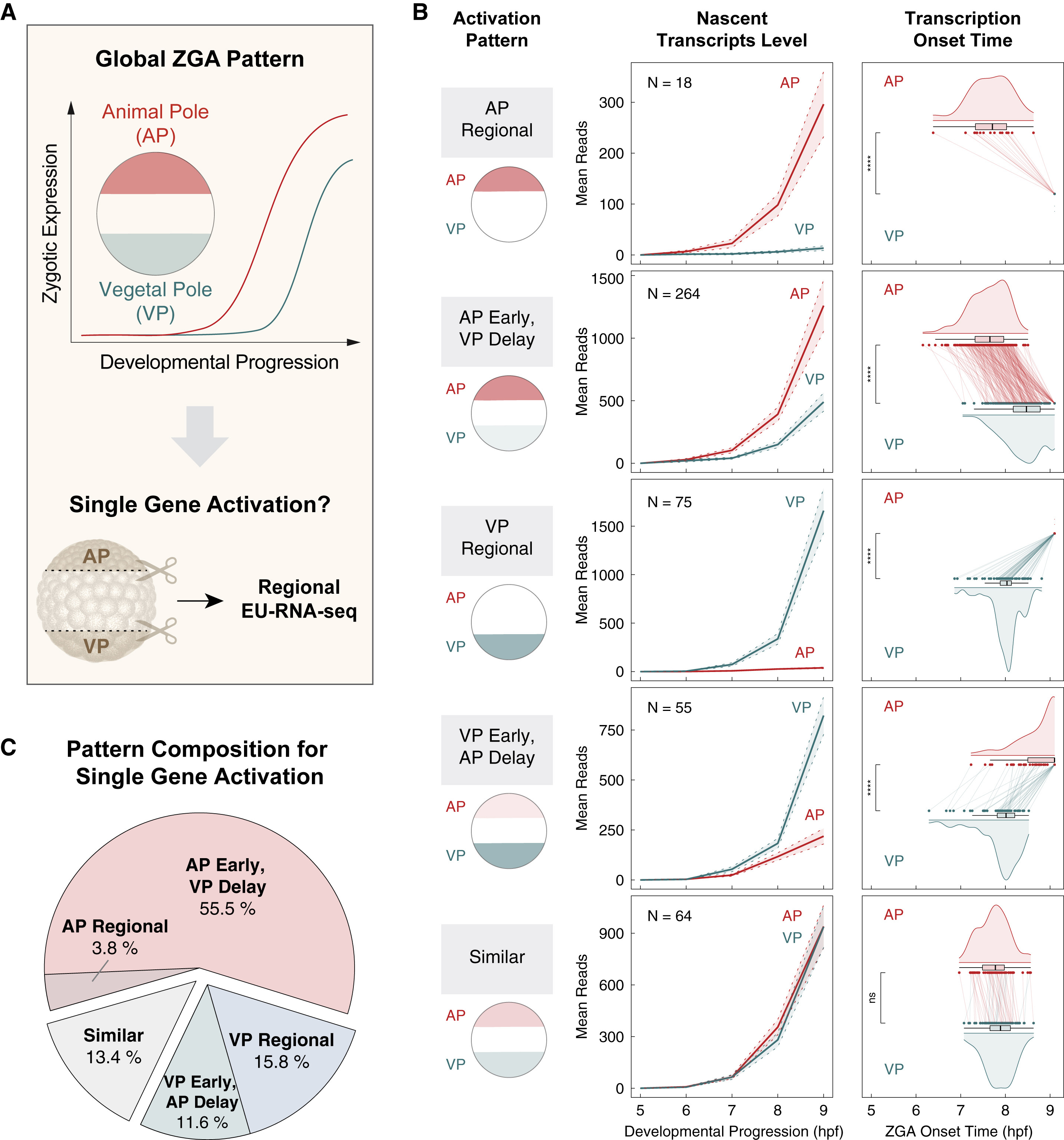 Figure 2. EU-RNA-seq on segmented embryos uncovers spatial patterns of single-gene activation (A) Schematic showing spatial patterns of ZGA observed from EU-RNA imaging, and strategy for classifying gene expression profiles from segmented embryos using regional EU-RNA-seq. AP, animal pole; VP, vegetal pole. (B) Categorization of distinct spatial patterns of activation for zygotic genes. Left: schematic of each pattern for gene activation. Middle: reads from EU-RNA-seq performed on the segmented AP (red) and VP (blue) regions from early embryo at 5â9 hpf. Transcript levels were thresholded to those at 5 hpf. Mean ± SE from indicated number of genes. Right: comparison of the activation onset time for transcription of each gene for AP (red) and VP (blue). ââââp < 0.0001; ns, not significant. Note that to compare and plot the activation onset time for those genes that were not activated during 5â9 hpf at AP or VP, their activation onset time was set to 9.1. (C) Percentage of zygotic genes that have distinct spatial patterns of expression during ZGA. A majority of genes (55%) show AP early and VP delayed expression. See also Figure S2 and Table S3. |