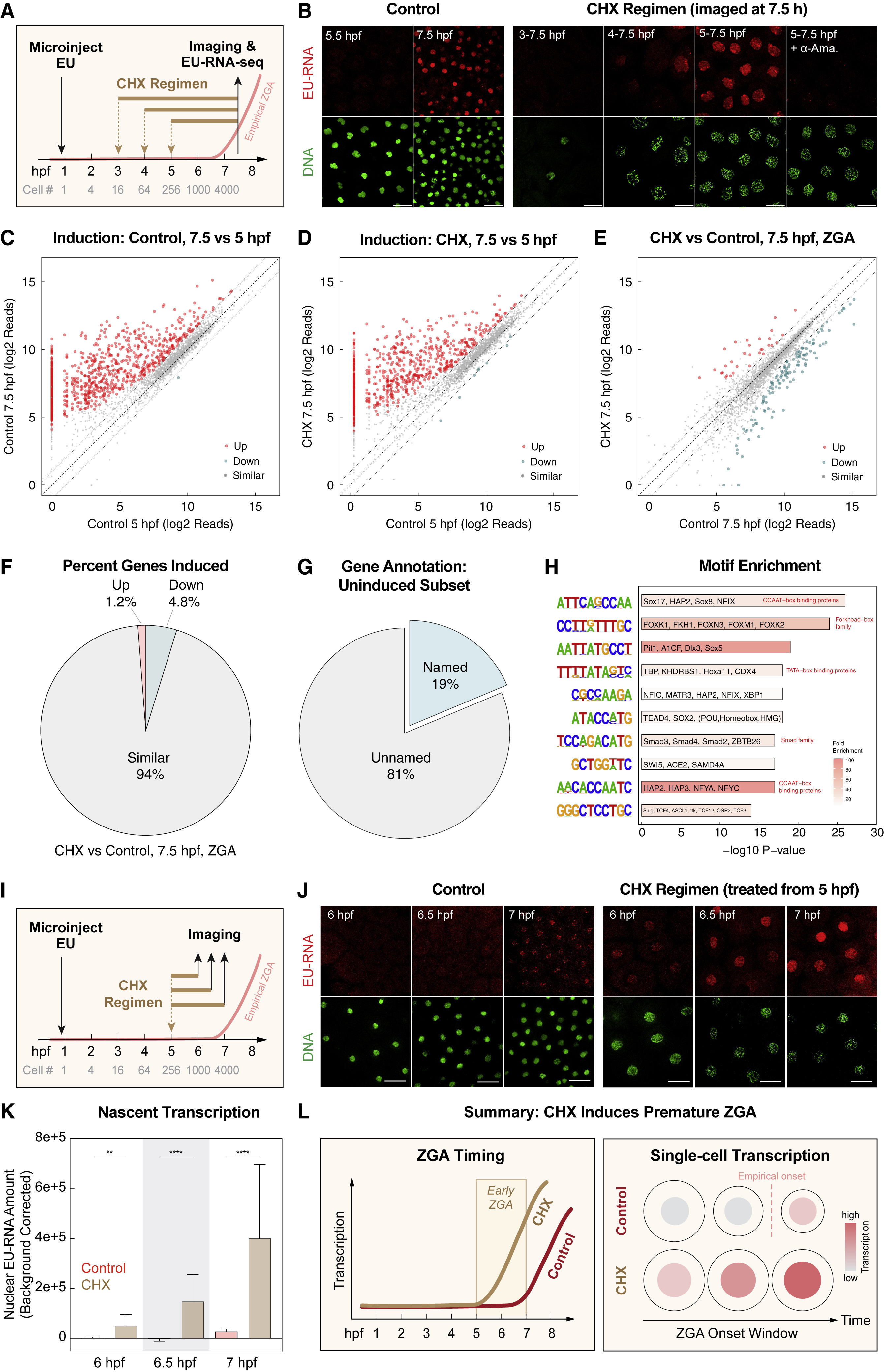 Figure 3. Reconciling mechanisms that regulate ZGA timing (A) Experimental design to probe effect of cycloheximide (CHX) treatment on ZGA regulation. Embryos were microinjected with EU at 1-cell stage; treated with CHX at 3, 4, and 5 hpf, respectively; and analyzed for nascent transcription by confocal imaging or EU-RNA-seq at 7.5 hpf. The red line indicates empirical ZGA timing in normal embryos. Estimated cell numbers at each hpf are shown for normal embryos. (B) Imaging nascent transcript (EU-RNA) accumulation in blastomere nuclei of whole-mount embryos. Maximum-intensity Z-projections of several slices from individual embryo stacks are shown. Left: representative confocal imaging of control embryos, prior to ZGA (5.5 hpf) and at the canonical onset of widespread ZGA (7.5 hpf). Right: representative confocal imaging of embryos treated with CHX from 3 to 7.5, 4 to 7.5, and 5 to 7.5 hpf, respectively. DNA channel illustrates number and size of nuclei. Nuclei in CHX-treated embryos are large and round indicating prolonged arrest in interphase. Nascent transcription is absent from embryos arrested from 3 to 7.5 hpf. Note: nuclear morphology in 3â7.5-hpf-arrested embryos is more heterogenous, but no EU-RNA was observed in nuclei from multiple repeats of the experiment. Nuclei in blastomeres arrested from 5 to 7.5 hpf show strong levels of nascent transcription, similar to and exceeding control 7.5 hpf embryos. Signal is RNAPII dependent; inhibited by α-amanitin treatment (bottom). Scale bars, 50 μm. (CâE) Nascent transcriptome reads for control (wild type) and embryos CHX-arrested from 5 to 7.5 hpf. Each dot represents individual genes from the selected 2,577 genes with log2 reads averaged from duplicates quantified by DESeq2. The differentially enriched genes in each group are labeled in red and blue, respectively, based on a 2-fold threshold (dashed lines) and adjusted p < 0.05. Accumulation of nascent reads from 5 to 7.5 hpf in control embryos (C) and from 5 to 7.5 hpf in embryos arrested in CHX from 5 to 7.5 hpf (D). (E) Comparison of reads during widespread ZGA (7.5 hpf) for control embryos versus embryos CHX-arrested from 5 to 7.5 hpf. (F) Embryonic arrest in interphase via CHX treatment from 5 to 7.5 hpf leads to widespread induction of zygotic genes normally induced during ZGA. Percentage of 2,577 genes in nascent 7.5 hpf transcriptome of control and that in embryos subject to 5â7.5 hpf CHX treatment that are upregulated (red), downregulated genes (blue) and similarly expressed (gray); calculated from (E). (G) Gene annotation for subset of the transcriptome that are not induced by arrest with CHX treatment from 5 to 7.5 hpf. Over 80% do not have assigned gene names in the Xenopus genome. (H) Motifs strongly enriched in the promoter regions of genes that do not induce in response to CHX arrest and prolonged interphase. (I) Experimental design to test whether CHX treatment induces premature ZGA. Embryos were microinjected with EU at 1-cell stage, treated with CHX from 5 hpf, and imaged for nascent transcription at 6, 6.5, and 7 hpf, respectively. The red line indicates ZGA timing in normal embryos at 22°C. Estimated cell numbers at each hpf are shown for control embryos. (J) Imaging of nascent transcription (EU-RNA) in nuclei of blastomeres on the animal pole of whole-mount control and CHX-arrested embryos. Maximum intensity Z-projections from individual embryo substacks are shown. Observation of premature ZGAânascent transcriptionâin CHX-arrested embryos treated from 5 to 6, 5 to 6.5, and 5 to 7 hpf. Nascent transcription is largely absent in control embryos at 6 and 6.5 hpf and beginning widespread accumulation in control embryos at 7 hpf. Scale bars, 50 μm. (K) Quantification of nascent transcription in control and CHX-arrested embryos in (J). The nuclear EU-RNA amount in blastomere nuclei was calculated by multiplying the integrated nuclear EU-RNA signal after cytoplasmic background subtraction by the nucleus volume. A total of 80â160 cells from at least three embryos were analyzed for each group. Data are represented as mean + SD, and statistical significance was determined by one-way ANOVA (Fisherâs LSD test). ââp < 0.01; ââââp < 0.0001. (L) Schematic summary of precocious ZGA initiated by CHX treatment. Left: CHX induces early ZGA from 5 hpf after embryos have gained transcriptional competence. Right: CHX treatment promotes nascent transcript accumulation to a higher level and at earlier times in individual nuclei. The color gradient indicates no or low (gray) to high (red) transcription in the nucleus. The red dashed vertical line indicates empirical widespread ZGA onset timing for control embryos. See also Figure S3. |