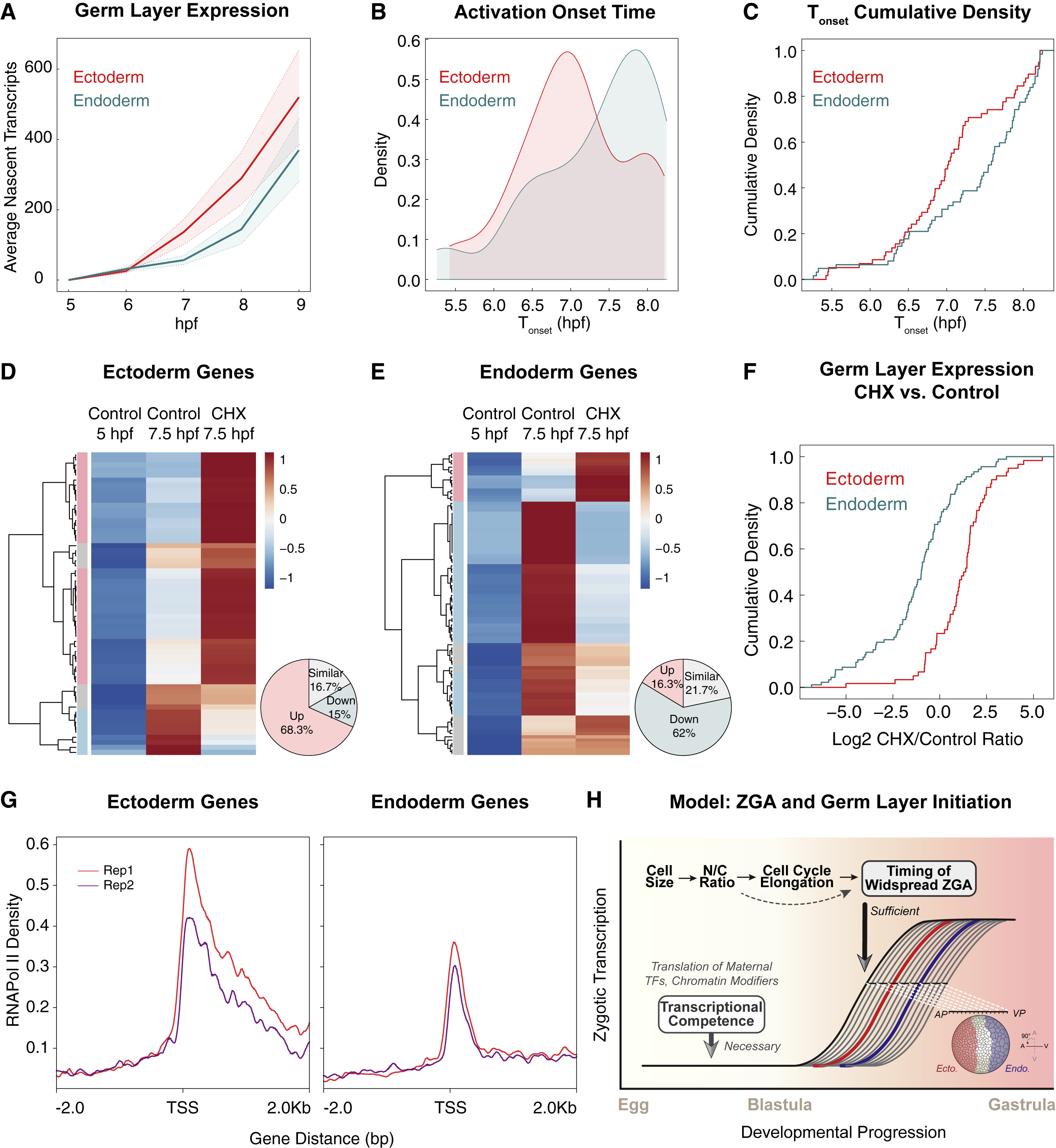 Figure 4. Timing of germ-layer initiation is correlated to spatially graded onset of ZGA (A) Average transcript levels for ectoderm and endoderm genes in blastula embryos. Nascent reads averaged from replicate embryos. Red, set of ectoderm genes (N = 111 genes); blue, set of endoderm genes (N = 172 genes) at 5â9 hpf. Mean ± SE. (B) Distribution of time of onset for transcriptional activation of individual genes within ectoderm (red) and endoderm (blue) sets. (C) Cumulative density of time of onset for transcriptional activation for ectoderm (red) and endoderm (blue) genes. (D and E) Heatmaps showing Z scores for induction of ectoderm (D) and endoderm (E) genes in control embryos at 7.5 hpf versus embryos treated with CHX from 5 to 7.5 hpf. Data are selected genes that have detectable transcriptional induction in control embryos from 5 to 7.5 hpf. Pie chart shows fraction of genes similar (gray) or upregulated (red) or downregulated (blue), comparing CHX-treated versus control embryos; threshold 1.5-fold difference. (F) Cumulative density showing induction relative to control of germ-layer genes in CHX-treated embryos at 7.5 hpf. Red, ectoderm; blue, endoderm. (G) Profile plots for ChIP-seq peaks of RNA Pol II for ectoderm and endoderm genes, respectively, in embryos at stage 10.5. Data from Session et al.19 The regions of transcription start site (TSS) ±2kb from two replicates are shown. The level of RNA Pol II binding in the indicated regions is higher in ectoderm genes than in endoderm genes. (H) Composite model and pathway describing regulated ZGA onset. Widespread ZGA is inhibited by rapid cell cycles in cleavage-stage embryos. As cell size reduces, due to cell division without cell growth, a DNA:cytoplasm ratio threshold is reached, promoting cell-cycle elongation and allowing for accumulation of nascent zygotic transcripts. Cell-cycle elongation is sufficient to promote large-scale ZGA in embryos that have achieved transcriptional competence. Translation of maternal TFs and histone acetyltransferases are necessary to generate transcriptionally competent embryos. Xenopus blastula embryos contain a gradient of cell sizes which achieve widespread ZGA onset at different times. A majority of the nascent transcriptome during ZGA displays early activation in smaller cells at the animal pole (AP)â the presumptive ectodermâand later activation in larger cells at the vegetal pole (VP)âthe presumptive endoderm. Chronological sequence of germ-layer induction may be linked to temporally graded onset of widespread ZGA in the blastula. Red, ectoderm genes; blue, endoderm genes. For clarity, the schematic of embryo is shown rotated 90° counterclockwise along the AV axis from the normal orientation of the embryo. Dotted arrow indicates that N/C ratio may affect ZGA transcription in a cell-cycle-independent manner. See also Figure S4. |