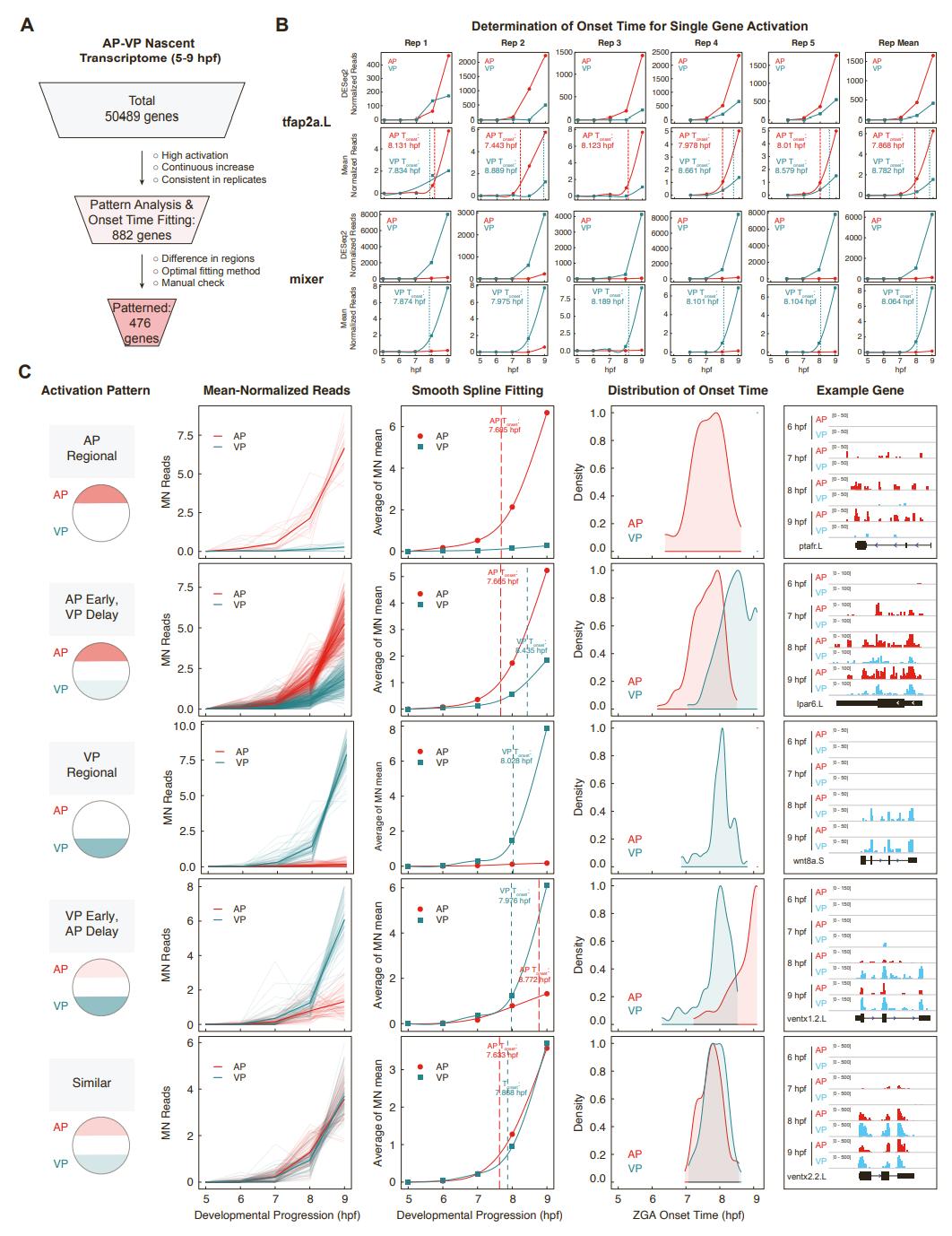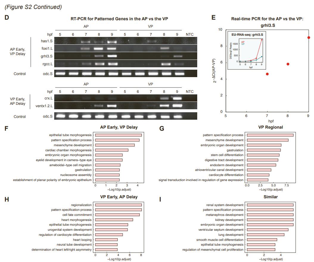 Figure S2. Characterizing spatial patterns of single gene activation in early Xenopus embryogenesis. Related to Figure 2. (A) Scheme for filtering genes used for analysis of activation patterns at the animal pole (AP) and the vegetal pole (VP). (B) Representative gene profiles to demonstrate the determination of activation onset time for individual genes. Genes tfap2a.L (top panels) and mixer (bottom panels) are shown as examples. DESeq2-normalized reads for 5 replicates (Rep 1-5) and their average (Rep Mean) from the nascent transcriptome at the AP (red) and the VP (blue) at 5-9 or 6-9 hpf. Mean-normalized reads were used for fitting with a smooth spline to determine the activation onset time at the AP and VP, respectively, based on reaching 20% of the maximum reads. (C) Categorization of 5 distinct spatial patterns for single gene activation. From left to right: schematic; mean-normalized reads for individual genes and their average; smooth spline fitting for the average mean-normalized reads to determine the activation onset time in AP and VP; histogram showing distribution of activation onset time for each gene within a category for the AP (red) and the VP (blue); genome browser view of example genes for each pattern. AP, red; VP, blue. (D) RT-PCR for example genes in the patterns of âAP Early, VP Delayâ (top panels) and âVP Early, AP Delayâ (bottom panels). Internal control was used for normalization. NTC, no-template control. (E) Real-time PCR for an example gene grhl3.S in the AP and VP. The expression level was measured from triplicates and the fold difference between AP and VP is represented as 2-âCt(AP-VP), where Ct(AP-VP) was calculated from the average Ct values of triplicates for AP and VP, respectively. Note that the expression was not detected at 5 and 6 hpf, and therefore the differences between AP and VP at these time points are not shown. As a reference for the expression pattern, the inset plot shows the average DESeq2 Reads by EU-RNA-seq in the AP and VP regions, respectively. (F-I) Top 10 enriched GO terms for patterned genes: âAP Early, VP Delayâ (F), âVP Regionalâ (G), âVP Early, AP Delayâ (H) and âSimilarâ (I). The GO terms for âAP Regionalâ genes could not be enriched due to small number of genes in this list. |