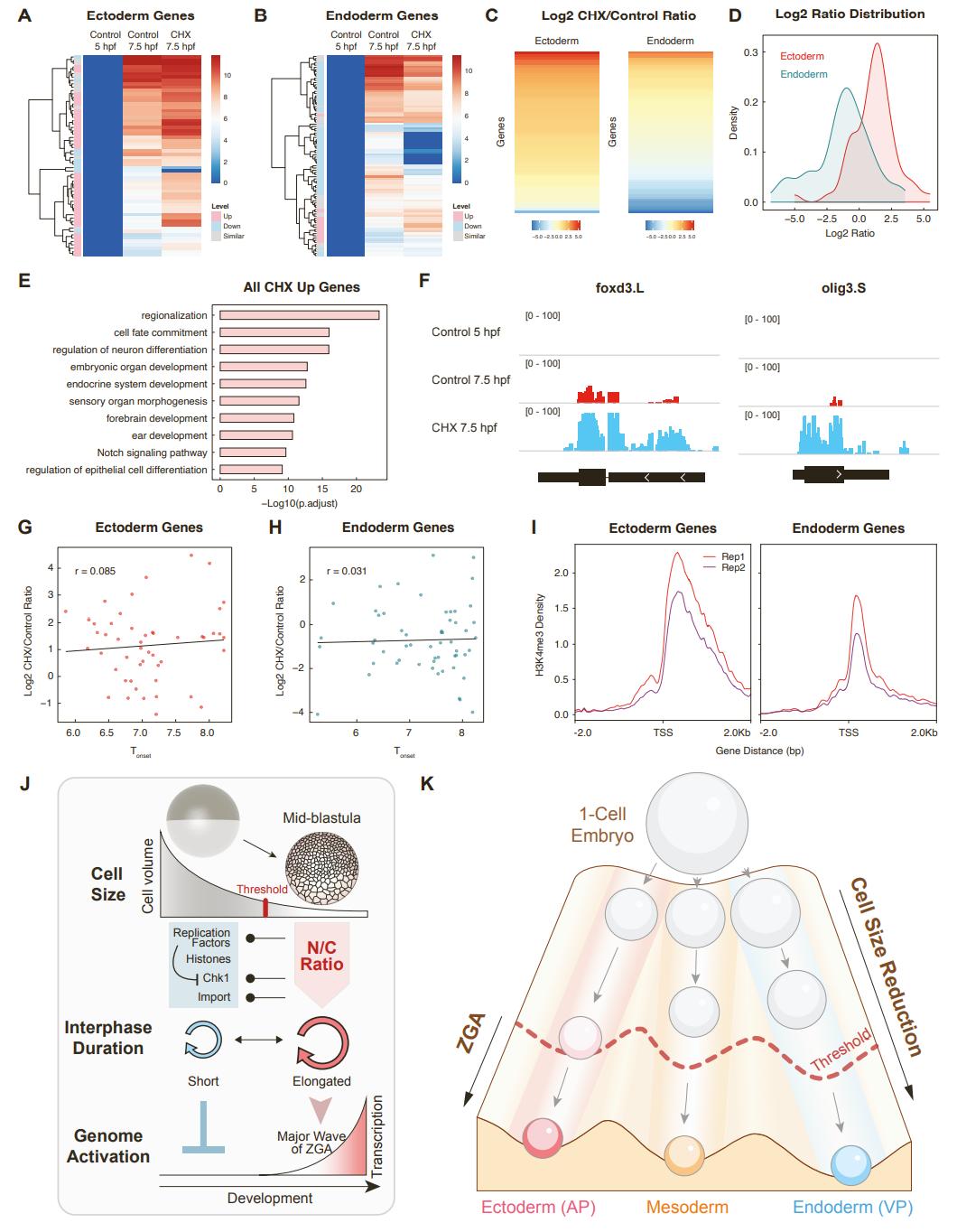 Figure S4. Premature cell cycle elongation over-induces the ectoderm germ layer program. Related to Figure 4. (A and B) Heatmaps for log2 reads of the ectoderm (A) and endoderm (B) genes with or without CHX treatment. Data shown are selected for genes that are induced in control embryos from 5-7.5 hpf. The up-regulated (red), down-regulated (blue) and not significantly changed (grey) genes are categorized based on a 1.5-fold difference threshold. (C) Heatmaps for log2 ratio of gene induction in CHX/Control for ectoderm (left) and endoderm (right) genes at 7.5 hpf. (D) Histogram for log2 ratio of gene induction in CHX/Control for ectoderm (red) and endoderm (blue) genes at 7.5 hpf. Ectoderm is largely over-induced by cell cycle elongation; endoderm is largely under-induced. (E) Top 10 enriched GO terms for genes that are significantly over-induced by cell cycle elongation (CHX). (F) Genome browser view of example ectoderm genes over-induced in CHX-treated embryos. (G and H) No correlation between activation onset time and log2 ratio of gene induction in CHX/Control for ectoderm (G) and endoderm genes (H) as in A and B. (I) Profile plots for ChIP-seq peaks of H3K4me3 for ectoderm and endoderm genes, respectively, in embryos at stage 10.5. The regions of transcription start site (TSS) +/- 2kb from two replicates are shown (data source: Session et al., Nature 2016). The level of H3K4me3 in the indicated regions is higher in ectoderm genes than endoderm genes. (J) Mechanistic regulation of ZGA via cell size, N/C ratio and cell cycle elongation in Xenopus early embryo. During Xenopus early development, a fertilized egg undergoes rapid reductive cell divisions without cell growth until mid-blastula stages, resulting in progressive reduction in blastomere cell size. Because the DNA amount remains constant in each cell, the N/C ratio increases. When the cell size or N/C ratio reaches a critical threshold, blastomeres elongate their cell cycle via Chk1, potentially via limiting replication factors and fork stalling, or reduced histone dependent repression of Chk1; RNAPII occupancy may also impact fork stalling. Early rapid divisions block zygotic transcript accumulation because interphase duration is too short for transcriptional accumulation. Once the cell cycle is elongated, a majority of nascent transcripts quickly build up, providing the basis for widespread gene expression during the major wave of ZGA. (K) A Waddington model for germ layer initiation whose timing is linked to regulated ZGA: cell size reduction down the landscape determines the rate at which ZGA initiates and subsequent germ layer specification. The fertilized egg undergoes asymmetric divisions generating small cells at the animal pole (AP), the presumptive ectoderm, and large cells at the vegetal pole (VP), the presumptive endoderm. Smaller AP cells reach a cell size threshold faster than the large VP cells. AP cells are the presumptive ectoderm and thus early ZGA leads to earlier expression of the ectoderm program. VP cells are the presumptive endoderm and delayed ZGA onset delays expression of the endoderm program. Note: the timing of initiation of the mesoderm program is inferred. |