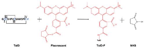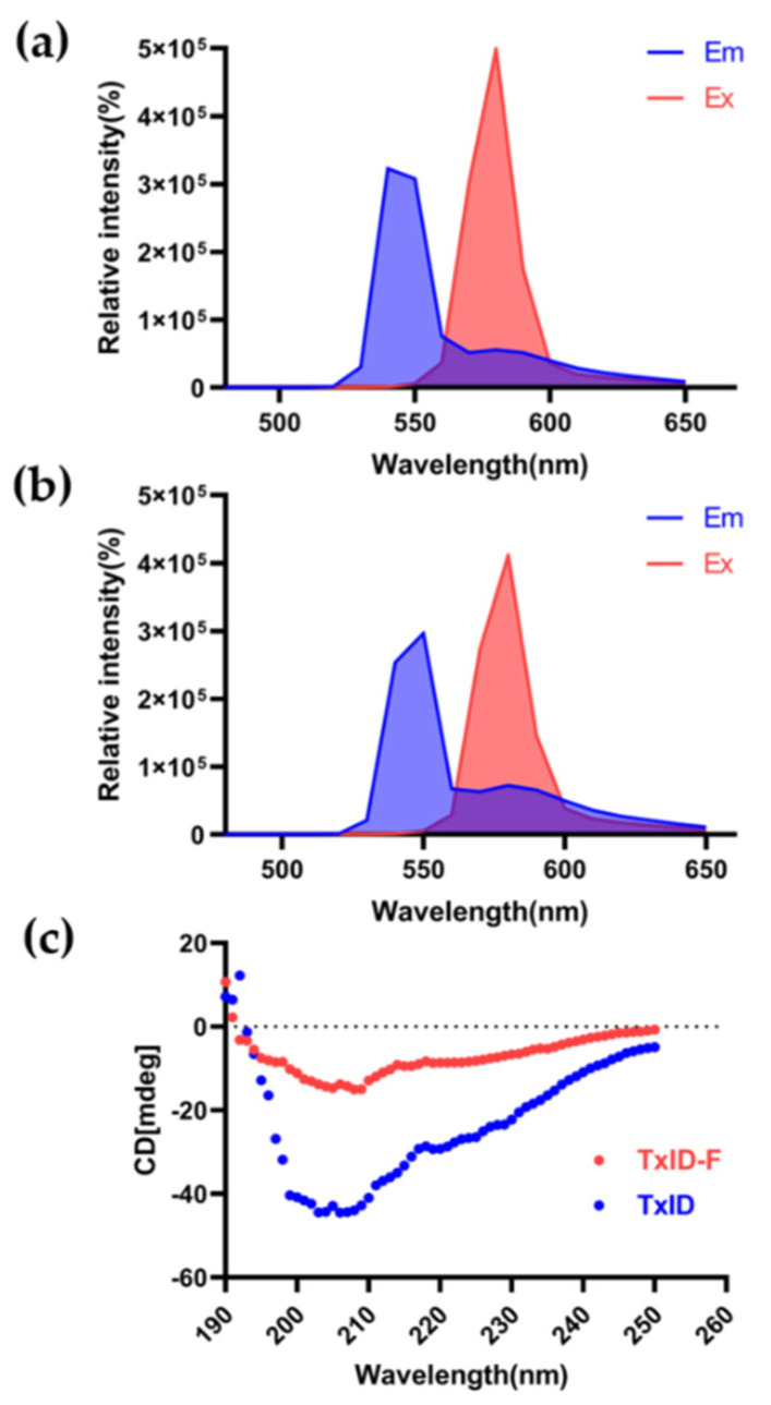 Figure 3. Fluorescence spectrum and circular dichroism analysis of TxID−F. Fluorescence spectrum of 5-TAMRA SE (a) and TxID−F (b). (c) The circular dichroism analysis (TxID: blue; TxID−F: red).