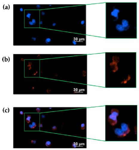 Figure 5. Flow cytometry analysis of TxID-F on RAW264.7 cells. Control RAW264.7 cells alone are compared using flow cytometry to the cells with TxID and TxID-F (RAW264.7 cell: (a), TxID: (b), TxID-F: (c). Histograms indicate live cell populations (n = 4).