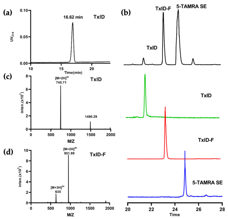 Figure 2. HPLC chromatograms and mass spectra of TxID and TxID-F. The peptides were analyzed on a reversed-phase analytical Vydac C18 HPLC column. Absorbance was monitored at 214 nm. (a) HPLC chromatogram of TxID, the retention time of TxID is 16.62 min with the linear gradient of 10% buffer B to 40% buffer B over 20 min. (b) HPLC chromatogram of TxID-F in the mixture of conjugation reaction; the retention time of TxID-F is 23.24 min by using a linear gradient of 5% buffer B to 55% buffer B over 35 min (TxID: green, TxID-F: red,5-TAMRA SE: blue). (c) Electrospray ionization mass spectrometry (ESI-MS) data for TxID with the observed monoisotopic mass of 1489.42 Da. (d) ESI-MS data for pure TxID-F with the observed monoisotopic masses of 1901.98 Da.