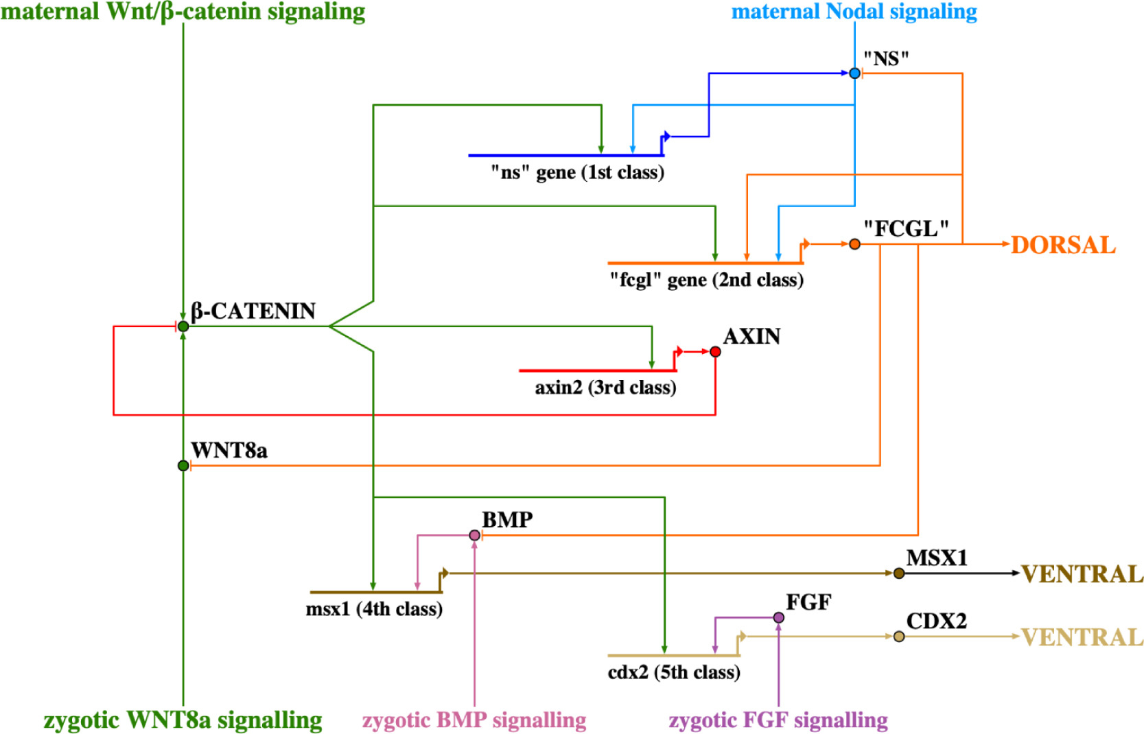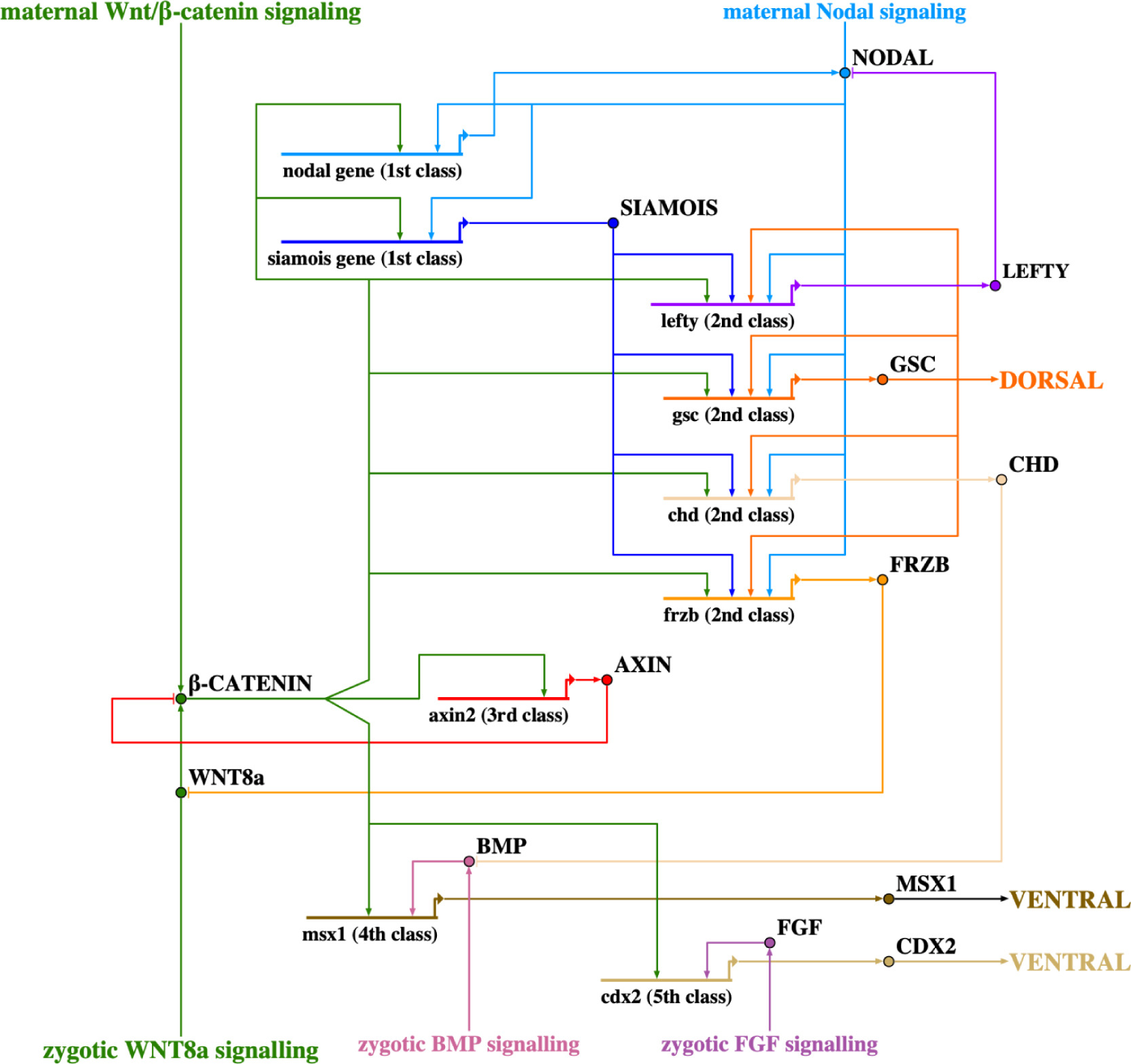 There are two phases of Wnt signalling in early vertebrate embryogenesis: very early, maternal Wnt signalling promotes dorsal development, and slightly later, zygotic Wnt signalling promotes ventral and lateral mesoderm induction. However, recent molecular biology analysis has revealed more complexity among the direct Wnt target genes, with at least five classes. Here in order to test the logic and the dynamics of a new Gene Regulatory Network model suggested by these discoveries we use mathematical modelling based on ordinary differential equations (ODEs). Our mathematical modelling of this Gene Regulatory Network reveals that a simplified model, with one "super-gene" for each class is sufficient to a large extent to describe the regulatory behaviour previously observed experimentally.