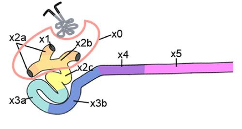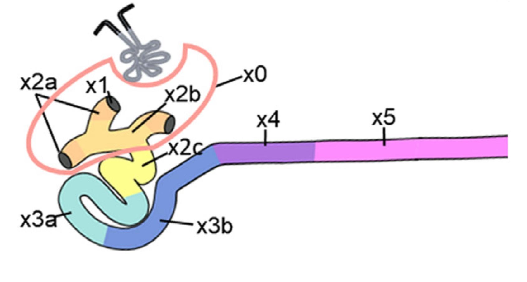 Based on an image from Corkins et al. Kidney Int. January 1, 2023; 103 (1): 77-86. Regions with an "X" label are parts of the pronephric nephron, expect for x0, which is the nephrocoel.