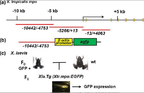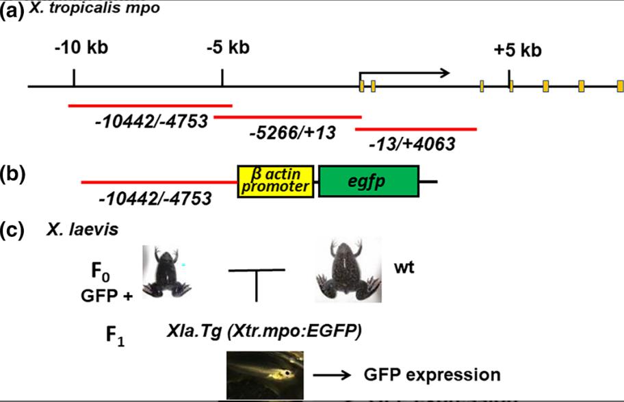 Figure 1. Production of a transgenic frog line possessing the mpo enhancer sequence. (a) Structure of the X. tropicalis mpo gene, showing three regions (−10,442/−4753, −5266/ + 13, and −13/ + 4063) amplified by PCR in the 5′-flanking region and the first exon sequence. Amplified DNA molecules were subcloned into the IS-pBSIISK(+)-β-egfp vector. (b) Structure of the DNA construct used for transgenesis. (c) The sperm nuclear transfer method was utilized for the production of transgenic animals (F0) and one GFP-expressing male frog (that expressed GFP at the highest level) was mated with a wild-type female. The F1 and F2 animals (offspring of a transgene-positive F1 and a wild-type animal) were analyzed to determine the expression of GFP in this study (Table S2).