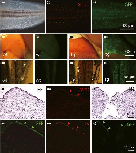 Figure 2. GFP expression in the transgenic tadpoles carrying the mpo enhancer sequence. (a–c) Whole-mount immunostaining of a transgenic embryo shows that the epidermal macrophages in the tail fin express GFP. Embryos were fixed at St. 40 and stained with XL-2 (b) or anti-GFP (c) antibody, indicating the coincidence of scattered signals. A bright-field image is also shown (a). (d–k) Anatomical views of the liver (d–g) and mesonephros (h–k) of a wild-type (d, e, h, and i) and a transgenic (tg) (f, g, j, and k) tadpole at St. 57 are shown. These hemopoietic organs and the spleen (data not shown) express GFP at a high level. (l–q) Frozen sections of the tg liver (l–o) and the mesonephros (p and q) of a St. 56 tadpole were stained with anti-GFP (m and q), the MPO antibody (n), or the T5 antibody (o). (l) and (p) are the same sections as (m) and (q), respectively, which were counterstained with HE. (l–o) Cross-section of the left lobe of the liver. (p and q) Cross-section of the mesonephros. Arrowheads in (m–o) and (q) show the positive staining at the cortex of the mesonephros and liver.