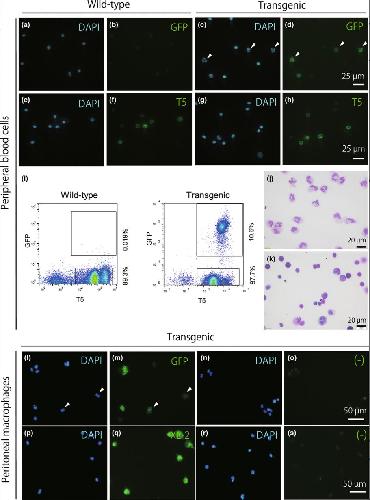 Figure 3. Myeloid cell-specific expression of GFP in transgenic frogs possessing the mpo enhancer sequence. (a–h) Smear samples of the peripheral blood cells from a wild-type frog (a, b, e, f) or a transgenic frog (c, d, g, h) were stained with anti-GFP antibody (b, d) or the T5 antibody (f, h). The same slides were counterstained with DAPI (a, c, e, g). (i–k) Flow cytometric analysis was performed as described in the Materials and Methods section. The histogram of a cell-sorting experiment shows that 10.6% of the red blood cell-depleted leukocyte fraction was GFP-positive (i), and the cytospin preparations of the GFP-positive (j) and -negative (k) fractions reveal that the GFP-positive cells were typical neutrophils. (l–s) The macrophages isolated from the peritoneal cavity were stained with anti-GFP (m) or the XL-2 antibody (q). The same slides were counterstained with DAPI (l, p). The results of the negative control without the first antibody reaction are also shown (o, s). Arrowheads in (l) and (m) show the GFP-positive cells with a lobulated nucleus.