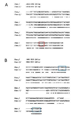SFig. 1 Alignments of two conserved short sequences of the enhancer region with X. laevis mpo.S genome sequence X. tropicalis mpo The VISTA analysis found a similarity in the enhancer sequence (-10,442/4,753) of X. tropicalis to the first intron of Xlmpo.S but not to the genome sequence of Xlmpo.L. Out of 4 short sequences with high scores, 2 short sequnces contained the conserved binding sites of PU.1 and C/EBPα, which are the common transcription factors for myeloid lineages. (A) Xtmpo flanking sequence (-8,853/-8,634) is aligned with Xlmpo.S genome sequence in the first intron (+3,976/+4,202). Red box indicates a predicted sequence of PU.1 binding domain. (B) Xtmpo flanking sequence (-5,460/-5,219) is aligned with Xlmpo.S genome sequence in the first intron (+8,540/+8,767). Blue box indicates predicted sequences of C/EBPα binding domain. Astarisk shows the matched nucleotide in the two aligned sequences.