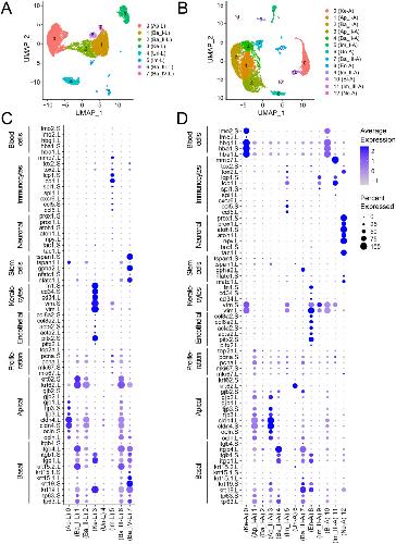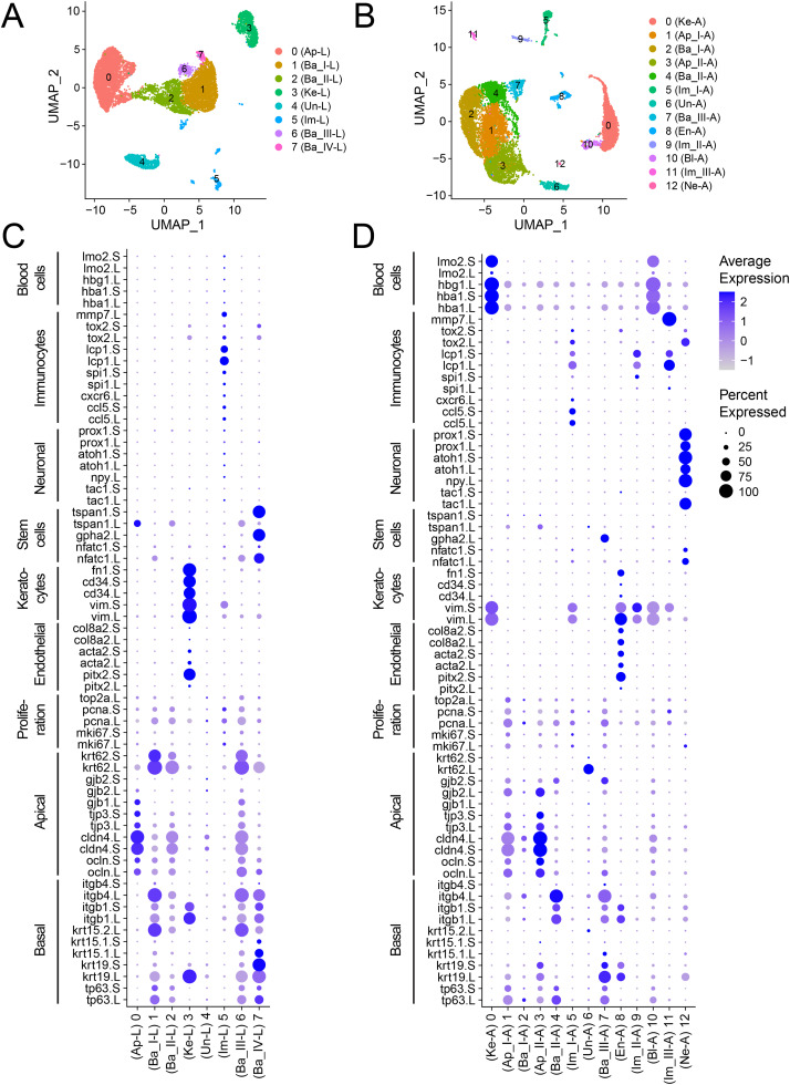 Fig. 2. Identification of cell types in scRNA-seq dataset of corneas from Xenopus larvae and adults. (A) Unbiased clustering of 10,659 high-quality cells from larval corneas after QC cutoffs, visualized by Uniform Manifold Approximation and Projection (UMAP). (B) Clustering of 12,155 filtered cells from adult frog corneas, visualized by UMAP. Each dot represents a single cell, and cells from the same cluster are similarly colored. Color codes in A, B represent unique clusters in each data set, and are not homologous. (C, D) Dot plot showing expression of known cell-type marker genes for each cluster. Dot diameter depicts the percentage of cluster cells expressing that marker and intensity encodes average expression of a gene among cells within that cluster. Abbreviations: Ap-L: Apical Larval; Ba-L: Basal Larval; Im-L: Immunocytes Larval; Ke-L: Keratocytes Larval; Un-L: Unknown Larval, and Ap-A: Apical Adult; Ba-A: Basal Adult; En-A: Endothelial Adult; Im-A: Immunocytes Adult; Ke-A: Keratocytes Adult; Ne-A: Neuronal Adult. |