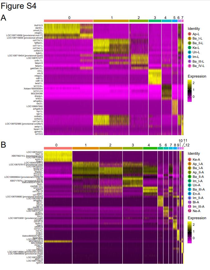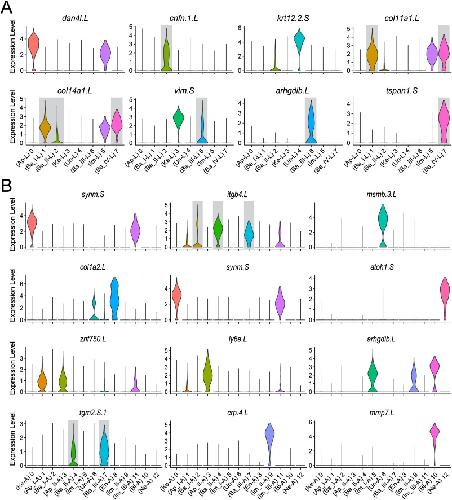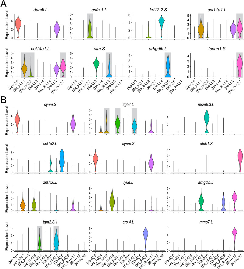Fig. 4. Identification of new marker genes for different cell types at two developmental time-points. (A) Violin plots showing the cluster-specific expression of the top-ranking candidate marker genes for each identified cell type in larvae. (B) Violin plots with cluster-specific expression of the top-ranking candidate marker genes for each identified cell type in the adult frog. The highlighted (grey) marker genes are differentially enriched in basal cell clusters of larvae and adults. |