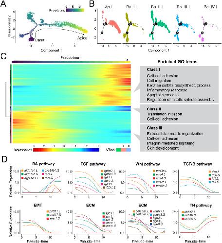 Fig. 5. Pseudo-temporal ordering of epithelial cells reconstructs the larval corneal differentiation process. (A) Pseudo-time plot indicating the cellular trajectory of all larval corneal basal and apical cells (Clusters Ap-L, Ba_I-L, Ba_II-L, Ba_III-L and Ba_IV-L). Single-cell trajectories were constructed, and pseudo-time values were calculated using Monocle 2. (B) Trajectories are colored by cluster identity that corresponds to the key in Fig. 2A. (C) Heatmap depicting the classes of genes that vary along the pseudo-time plot during larval corneal differentiation. Pseudo-time is indicated by the color key similar to that shown in (A). Gene Ontology (GO) analysis was performed using DAVID and the enriched GO terms (P < 0.05) in each class are listed. Relative expression is indicated by the color key. (D) Gene expression kinetics along the pseudo-time progression of representative genes belonging to different pathways and processes, as indicated. Genes shown belong to the Retinoic Acid pathway (RA pathway), the Fibroblast Growth Factor pathway (FGF pathway), the Wnt pathway, Transforming Growth Factor (TGF) beta pathway, Epithelial-to-Mesenchymal Transition (EMT), Extracellular Matrix (ECM) deposition, and the Thyroid Hormone pathway (TH pathway). |