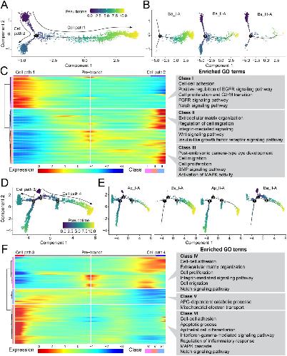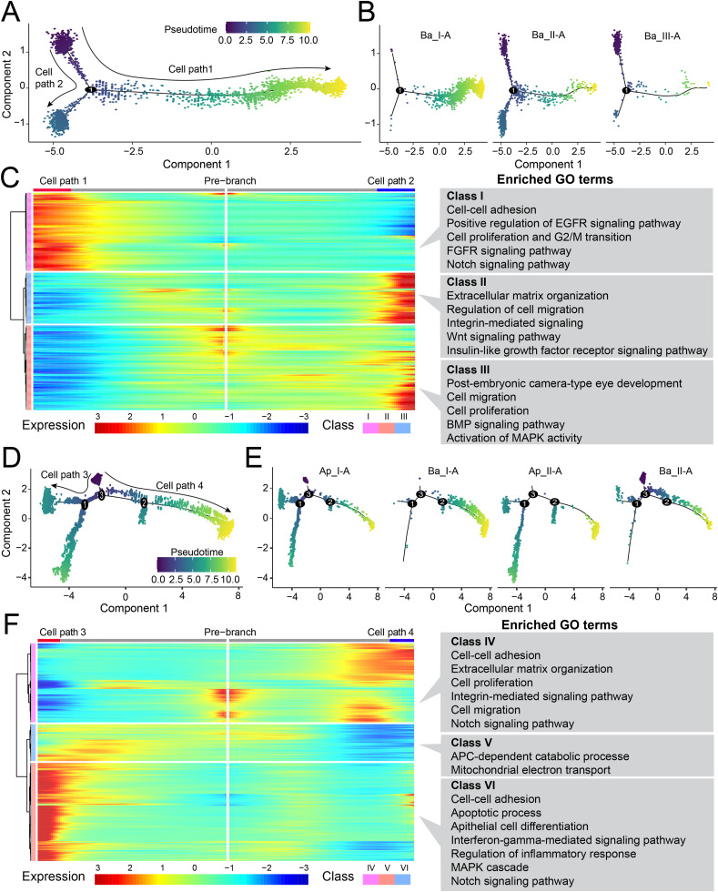 Fig. 6. Differentiation trajectory in adult corneal epithelium involves key cell path decisions.(A) Pseudo-temporal ordering of all cells from the basal epithelium present in the adult cornea (Ba_I-A, Ba_II-A and Ba_III-A). The trajectory has two different paths distributed around branch point 1, namely, cell paths 1 and 2. The arrows indicate the developmental directionality of the cell clusters, based on our inference. (B) Distribution of cells from three basal clusters along the pseudo-time shown in A. While cells of Ba_I-A are present towards the end of path 1, cells of Ba_II-A are distributed throughout the trajectory, and cells of Ba_III-A are located at start of trajectory. (C) Heat map showing bifurcation of gene expression programs executed along the pseudo-time after branching. Three distinct classes of genes (with top GO terms enriched in each class) were identified. (D) Pseudo-time plot to further resolve the cellular trajectories from basal clusters (Ba_I-A and Ba_II-A) to apical clusters (Ap_I-A and Ap_II-A). The branch point 3, which is under evaluation has two different paths, namely cell paths 3 and 4, around it. (E) Pseudo-time plots showing distribution of each of the four clusters along combined cellular trajectories shown in D. (F) Heatmap of gene expression along the pseudo-time plot in D, with the top GO terms enriched in each class of genes, as indicated. |