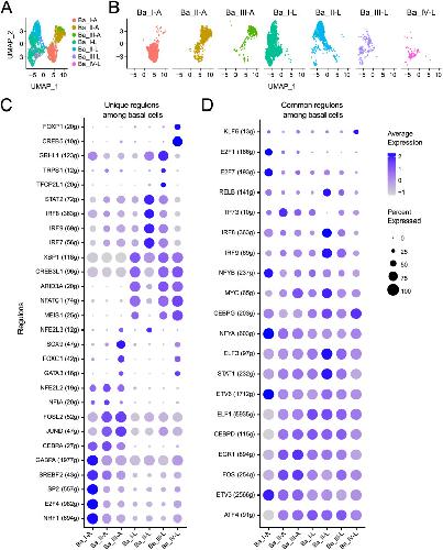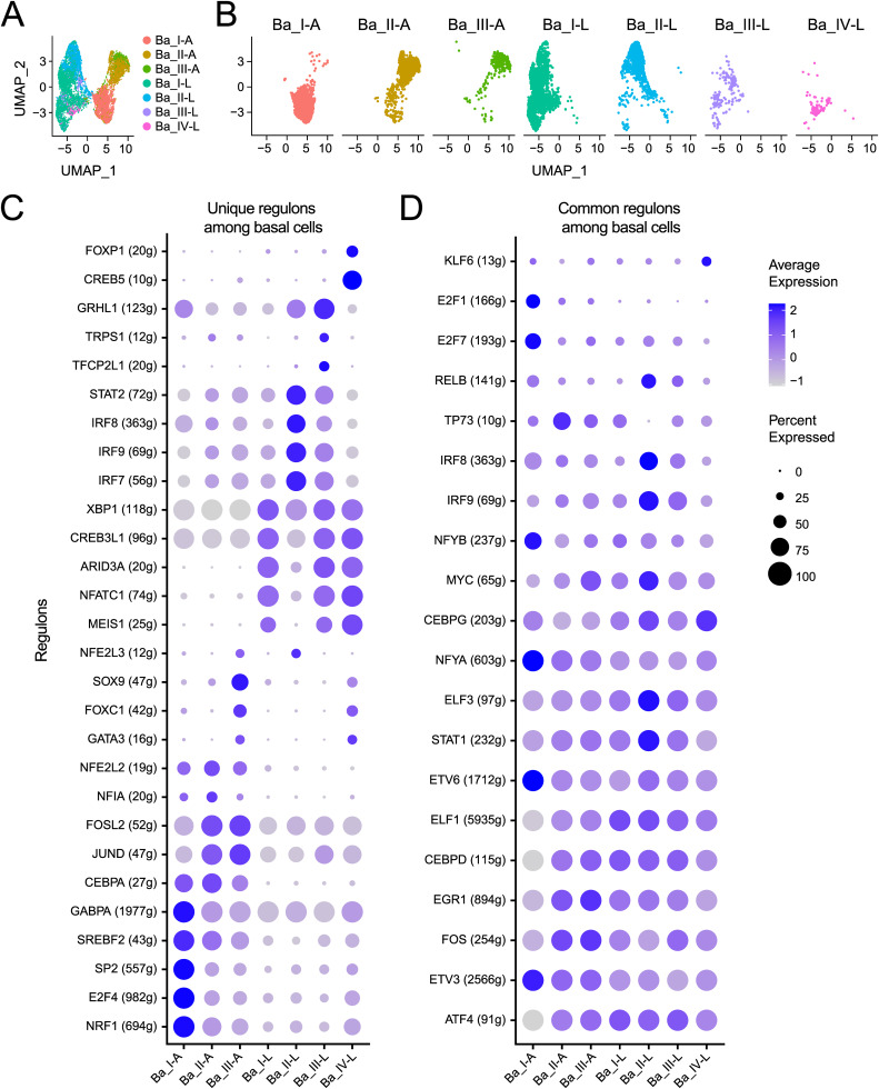 Fig. 7. Distinct gene regulatory networks are active in basal epithelial cells of the larval and adult frog corneas. (A) UMAP projection of all basal cells based on the AUC scores for each regulon calculated using SCENIC. Cells belonging to the same regulon are colored, according to the key. (B) AUC score based UMAP projection, grouped according to the origin of basal cells. Regulons of basal cells (Ba_I-L, Ba_II-L, Ba_III-L and Ba_IV-L) belonging to larval frogs group together and overlap, whereas regulons from adult basal cells (Ba_I-A, Ba_II-A and Ba_III-A) are separated from larval regulons. (C, D) Dot plot showing unique and shared regulons that are active in different basal cell states. Dot diameter depicts the percentage of cluster cells expressing that regulon and color intensity encodes average expression of a regulon among cells within that cluster, as indicated in the keys. |