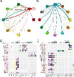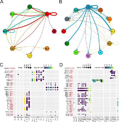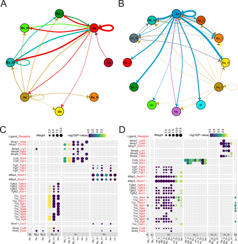 Fig. 8. Dynamics of cell-cell communication networks active in the larval and adult frog corneas. (A, B) Network diagrams depicting significant cell-cell interactions marked by arrows (edges) pointing in the source-to-target direction. Thickness of arrows shows the sum of weighted paths between cell types, and the color of arrows corresponds to the source. Network diagrams for (A) larval and (B) adult frog corneas are shown. (C, D) Dot plot of representative outbound signals to different cell types in (C) larval and (D) adult frog corneas. Size of each dot signifies the weight of the corresponding ligand-receptor interaction, and the color indicates negative log10 P-value of the source-to-target interaction, as indicated in the keys. The ligands of the source cell are in black and the receptor present on the target cell follows in red. Empirical P-values were calculated and Benjamini-Hochberg correction was performed. The detailed ligand-receptor interactions are shown in Fig. S7. |