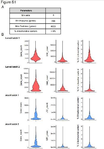 Fig. S5. Proportion of cell populations in each cluster for (A) larval and (B) adult scRNA-seq datasets. Numbers on each bar indicate the number of cells. |