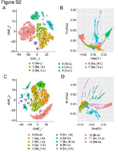 Fig. S2. (A, B) tSNE and PHATE projections of all larval corneal cells. (C, D) tSNE and PHATE projections of all adult corneal cells. Cells are colored by annotated cell types, as shown in Fig. 2. |