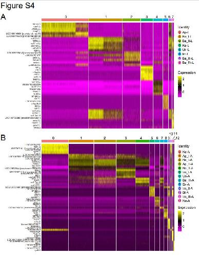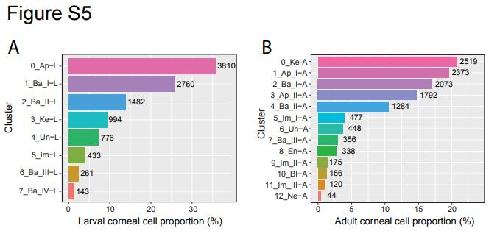Fig. S4. Heatmap demonstrating the cluster-specific expression of the top 5 ranking novel candidate marker genes in each cluster of (A) larvae and (B) adult cornea cells identified in the scRNA-seq datasets. Cells are colored by annotated cell types, as shown in Fig. 2. |