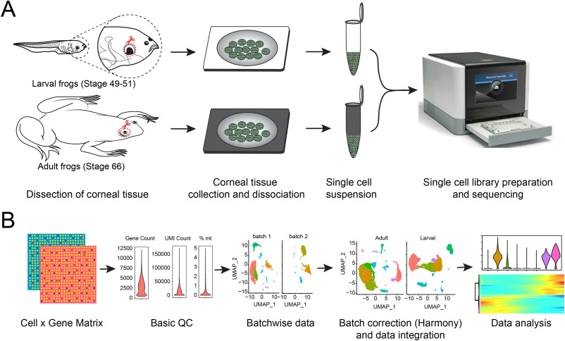 Fig. 1. Overview depicting workflow for isolation of corneal cells from Xenopus for single-cell RNA sequencing (scRNA-seq). (A) Isolation of corneal epithelial cells from Xenopus larvae and adults. Corneal epithelia were dissected, pooled and dissociated to isolate single cells. After determining high cell viability, a single-cell library was prepared using the 10X Chromium Single Cell 3′ Reagent Kit (V3). (B) Computational workflow demonstrating data processing and analysis pipeline for scRNA-seq data. Cell Ranger was used to align raw reads and generate feature-barcode matrices. Seurat v3.1 was used to perform basic quality check (QC) and normalization, followed by use of Harmony to remove batch-specific effects. |