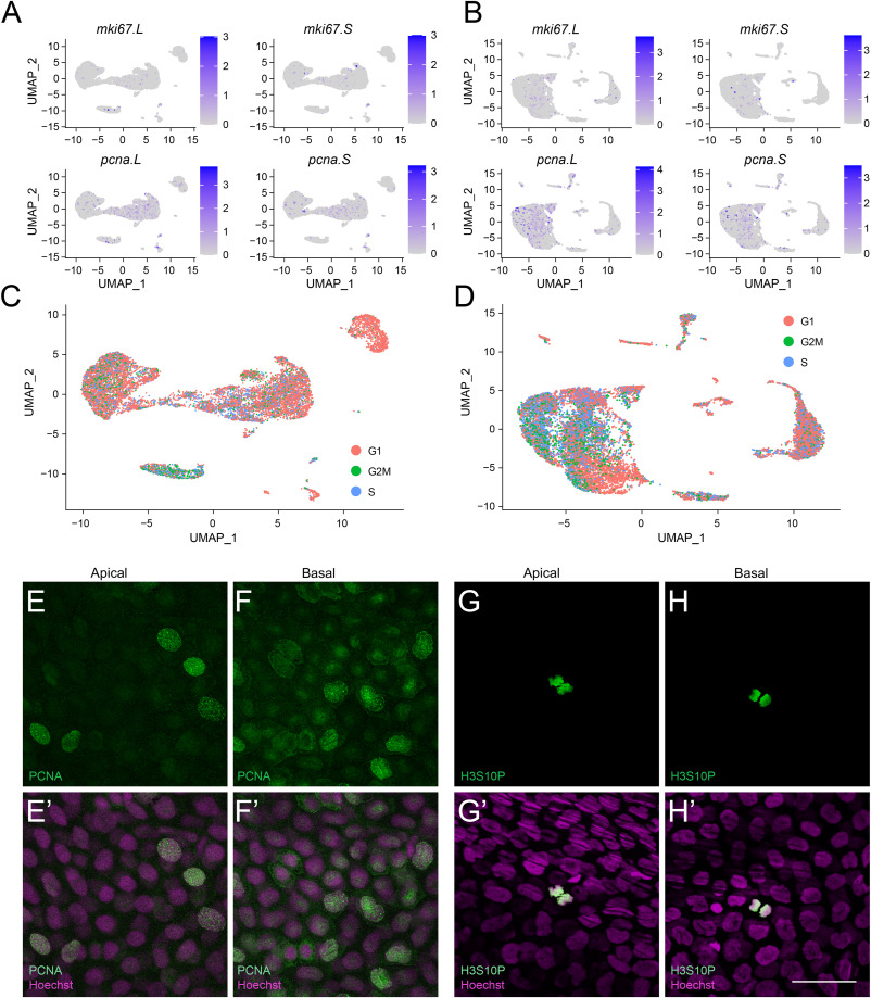Fig. 3. Proliferative cells are distributed throughout the corneal epithelium in Xenopus. (A, B) Gene expression UMAP overlay with proliferation genes mki67.L, mki67.S, pcna.L, and pcna.S in larval (A) and adult (B) corneas. Color intensity correlates with the relative transcript level for the gene. (C, D) UMAP plot showing the cell cycle status of each cell in (C) larval, and (D) adult clusters, determined using the “CellCycleScoring” module in Seurat v3.1. Color key indicates the cell cycle state. (E–F) Confocal images showing immunofluorescent staining for Proliferating Cell Nuclear Antigen (PCNA) (green) in the tadpole corneal epithelium. (E′-F′) Merged images for E-F with Hoechst labeled nuclei (magenta). (E, E′) Nuclear staining for PCNA is detected in some apical epithelial cells. (F, F′) PCNA labeled nuclei are detected in the basal epithelium. (G–H) Confocal images showing anti-phospho-Histone H3 (H3S10 P) (green) in the tadpole corneal epithelium. (G′-H′) Merged images for G-H with Hoechst labeled nuclei (magenta). (G, G′) Mitotic nuclei (H3S10 P) are present in a few apical epithelial cells. (H, H′) H3S10 P labeled nuclei are detected in the basal epithelium. Scale bar in H′ equals 50 μm for E-H’. |